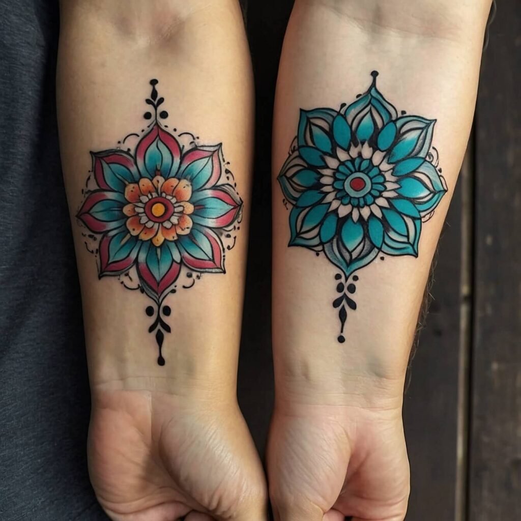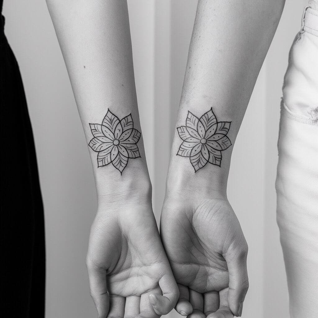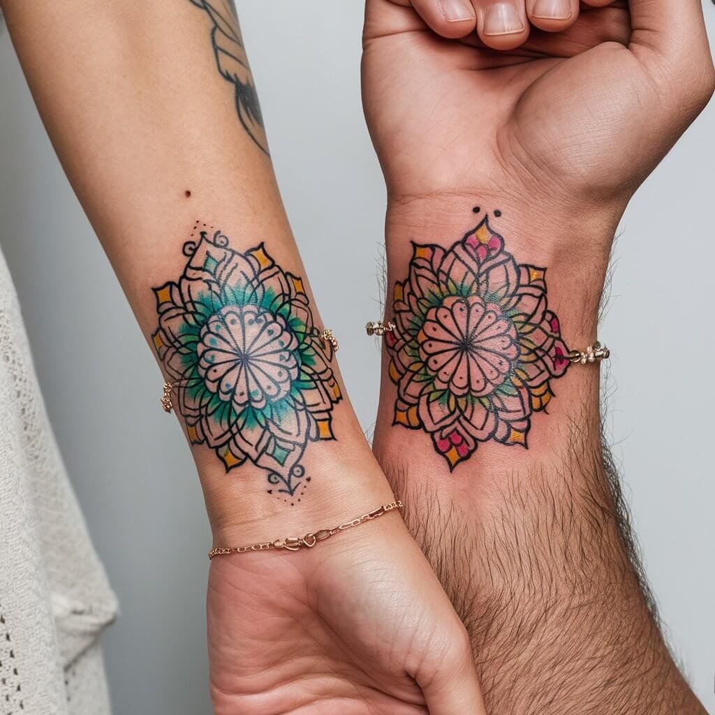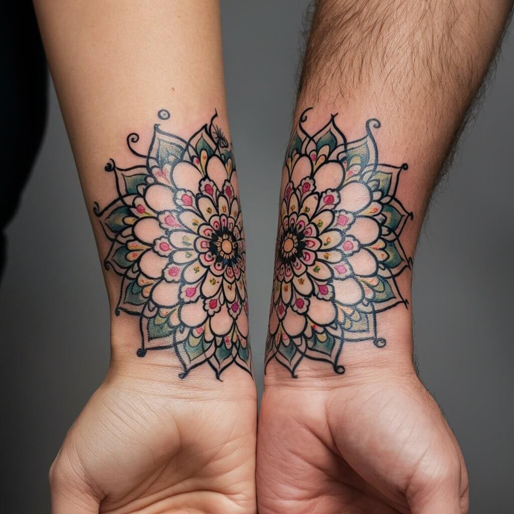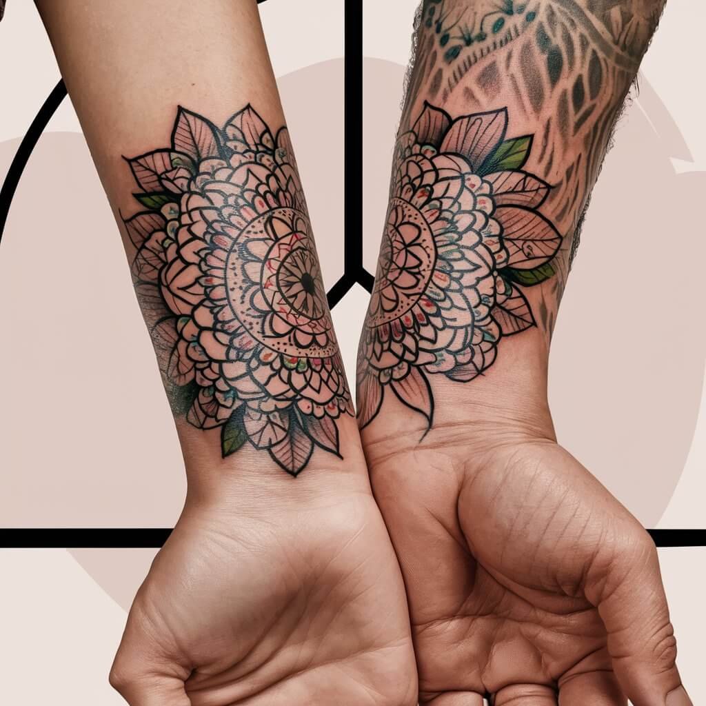 In the end, our matching flower mandala wrist tattoos became a beautiful symbol of our love and commitment. Every time I look at my tattoo, I’m reminded of the journey we’ve taken together and the bond we share.Getting matching tattoos was not just about the ink; it was about creating a lasting memory and a physical representation of our relationship. The process of choosing the design, consulting with our artist, and caring for our tattoos brought us closer together.