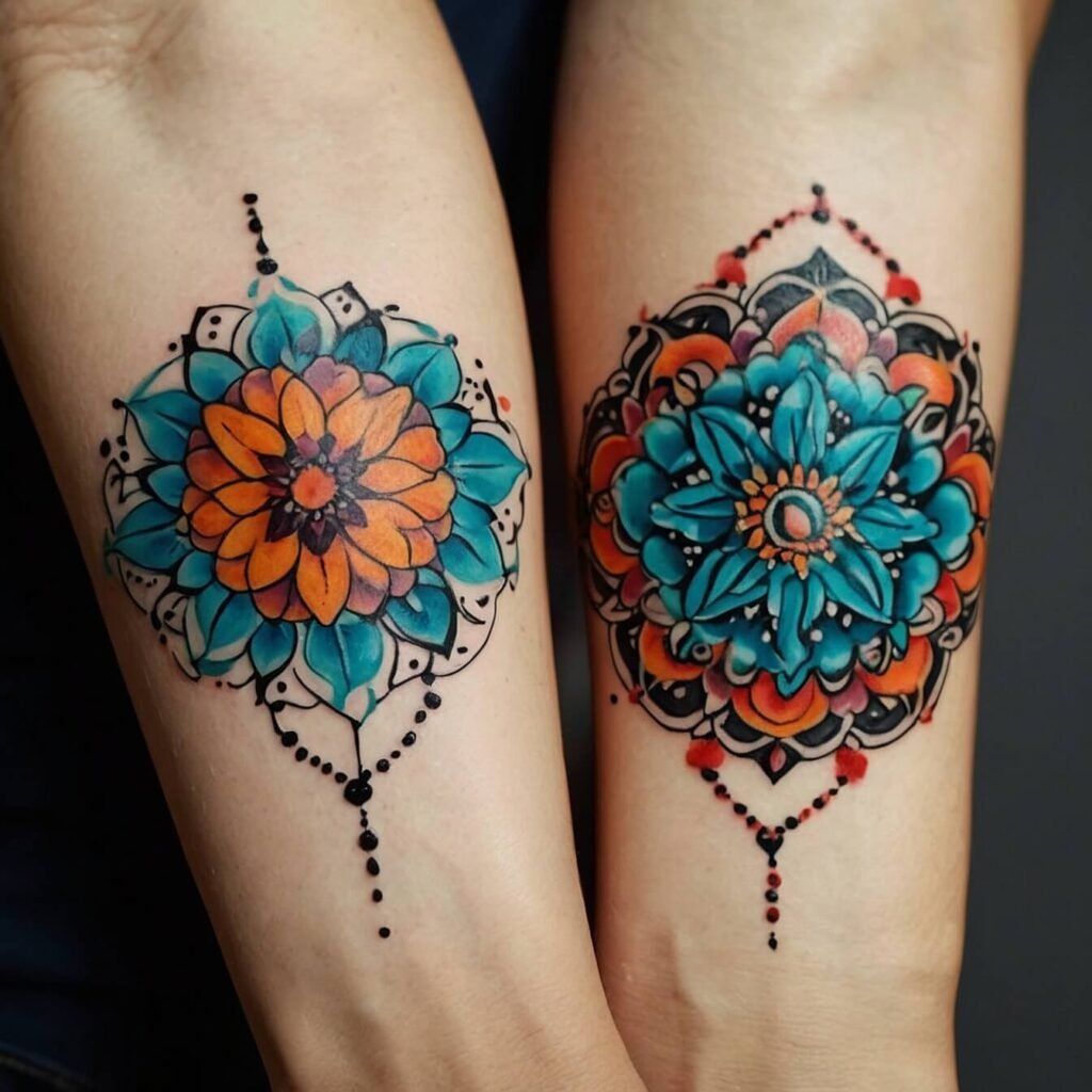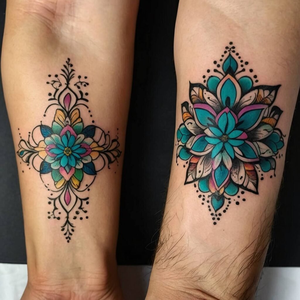 Flower mandala tattoos in complementary colors are ideal for couples looking for a vibrant expression of their relationship. These designs employ contrasting but harmonious color schemes, resulting in a striking visual impact. Matching mandalas in complementary colors represent the balance and dynamic nature of your relationship. Each tattoo is a vivid representation of your connection, combining beauty and meaning.