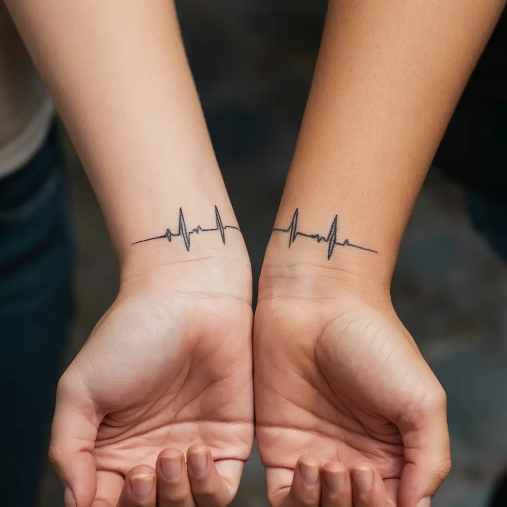 Tattoo Meaning: A continuous heartbeat line across multiple tattoos shows that your friendship is alive and strong. It symbolizes life, love, and connection.