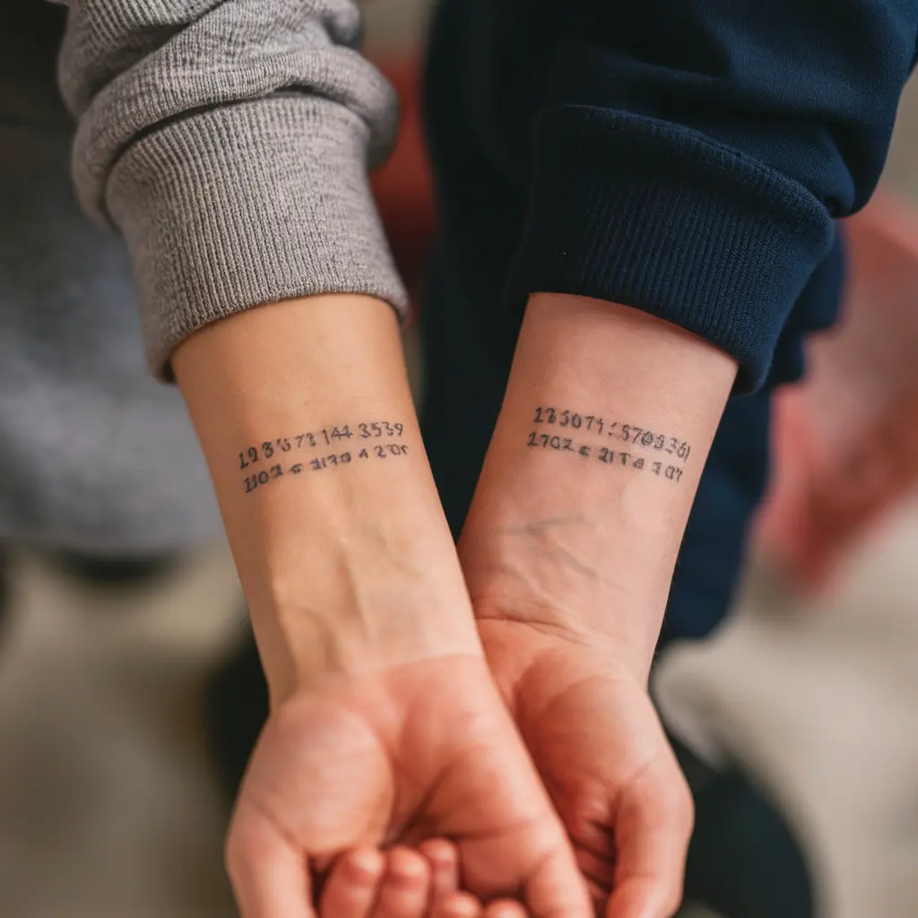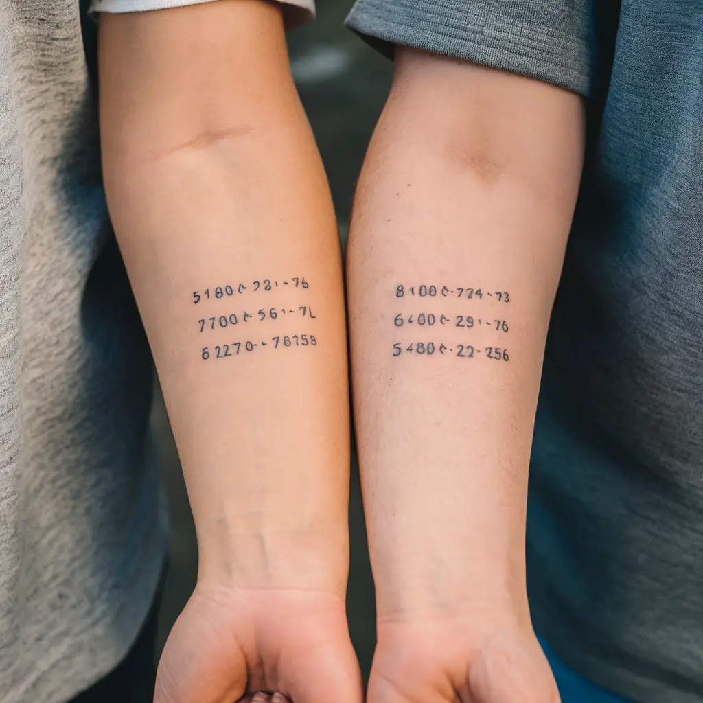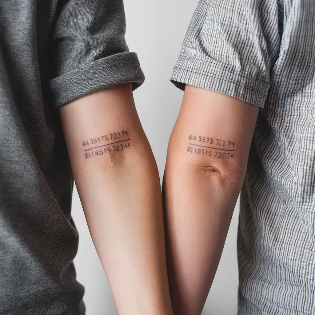 Description: Matching tattoos of the coordinates of a special place—like your childhood home or a favorite vacation spot.