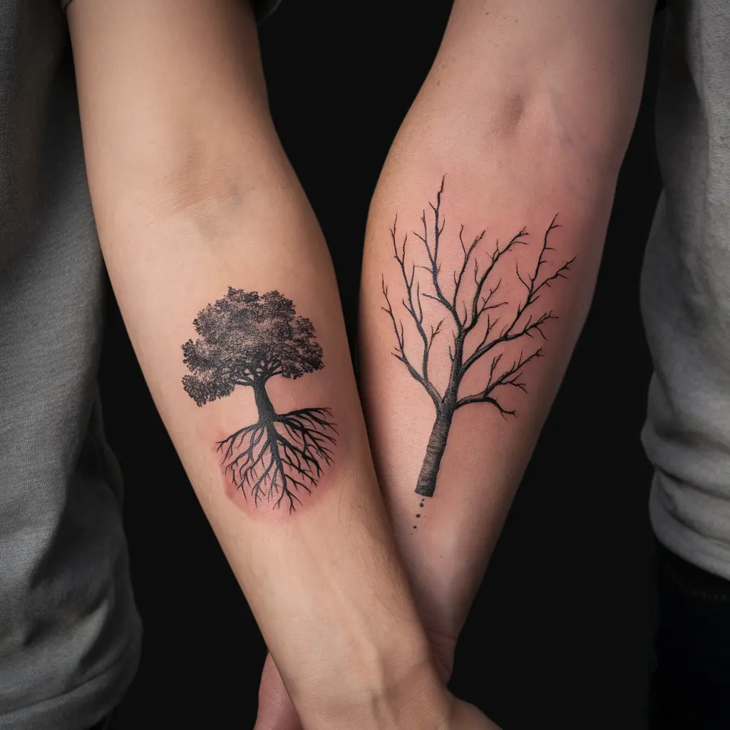 Description: A single tree design where one sibling has the branches and the other has the roots.