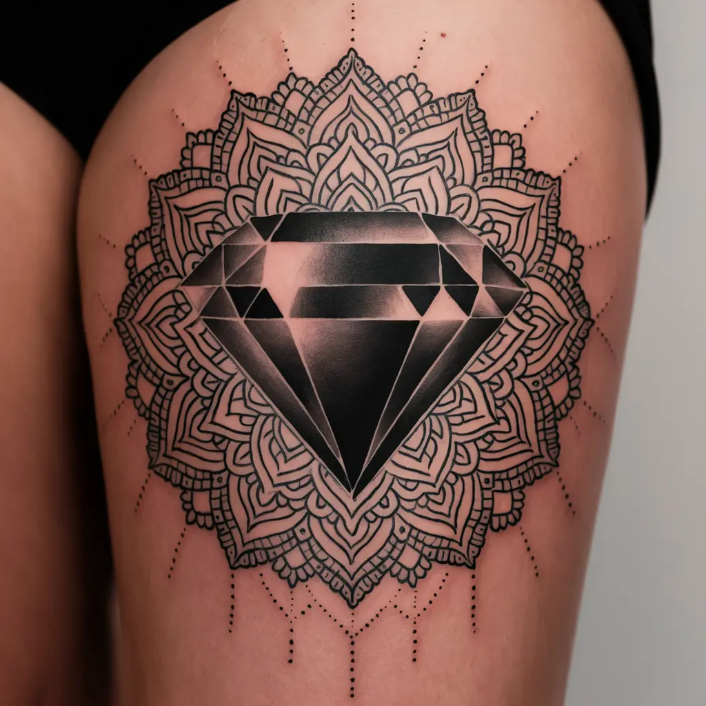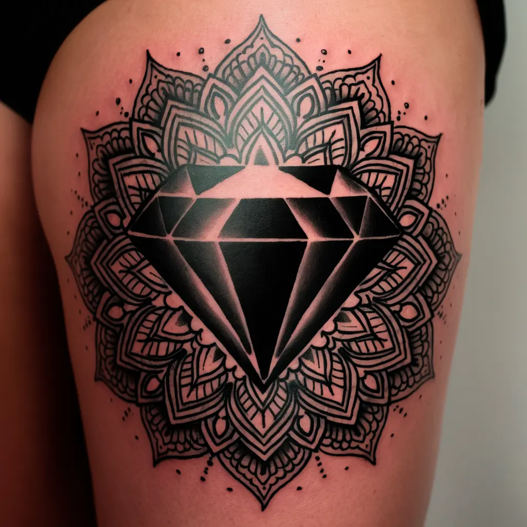 A mandala-inspired diamond tattoo blends the spiritual energy of a mandala with the clarity and strength of a diamond. Intricate lines and detailed shading give the tattoo a mystical feel, making it a perfect choice for someone who values both beauty and spirituality.