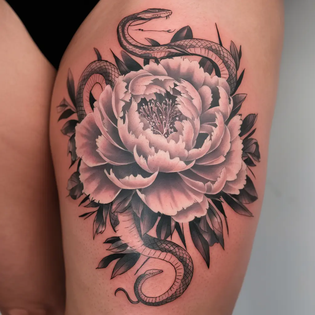 Peonies are often associated with beauty, wealth, and good fortune, while snakes symbolize protection and transformation. Together, they form a balanced tattoo design that represents the combination of beauty and power.