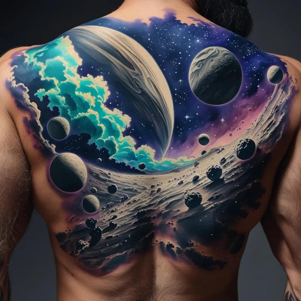 Placement: Perfect for the back or chest, where the wide canvas can capture the entire cosmic scene.