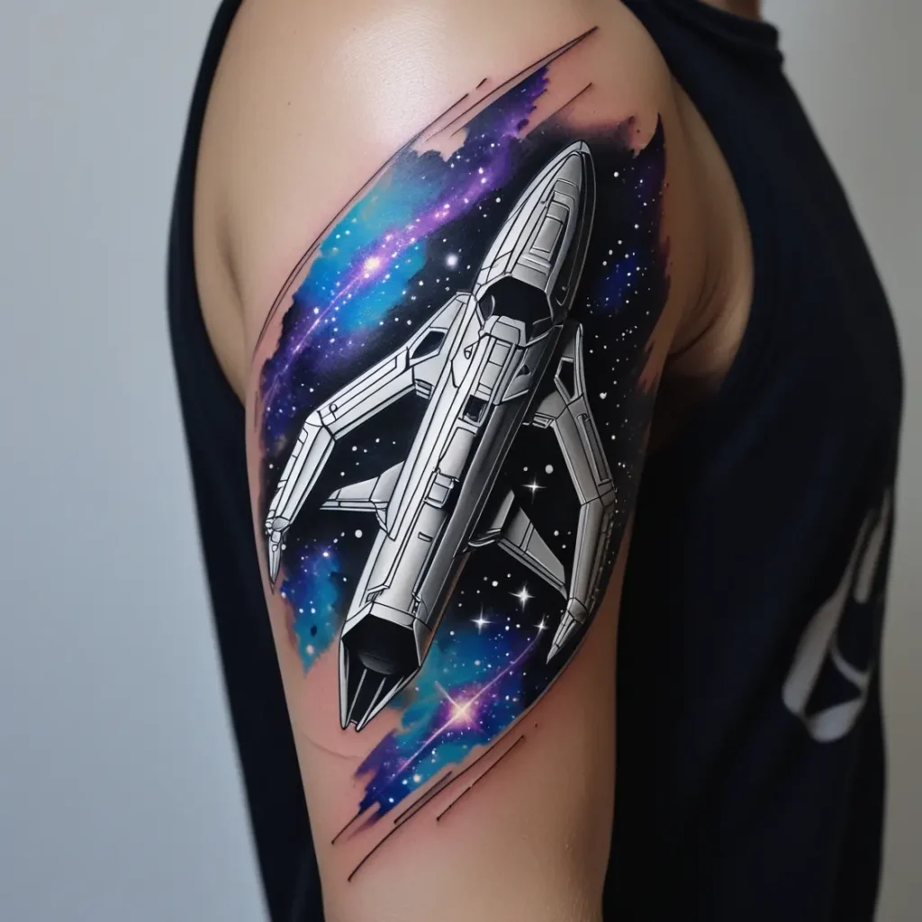 Placement: Ideal for the upper arm, thigh, or side of the torso where the ship can be shown with stars in the background.