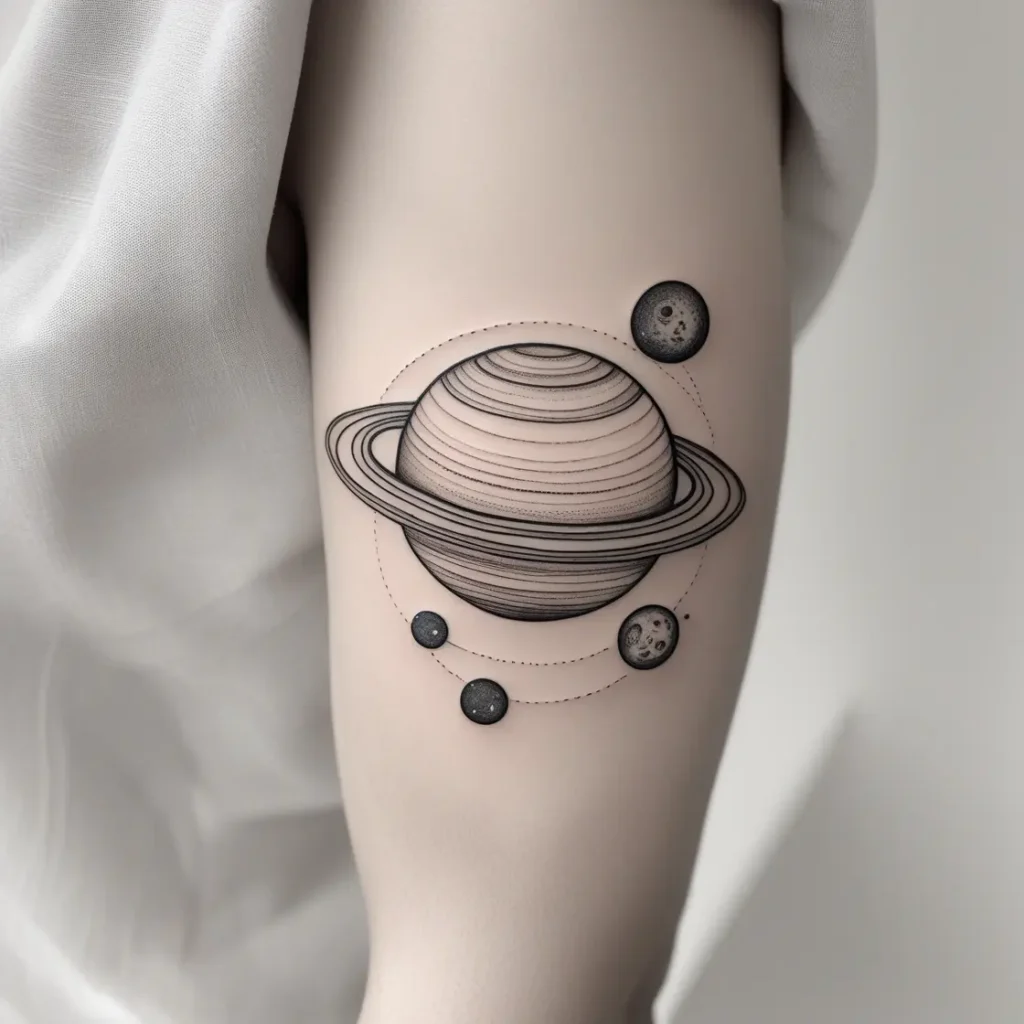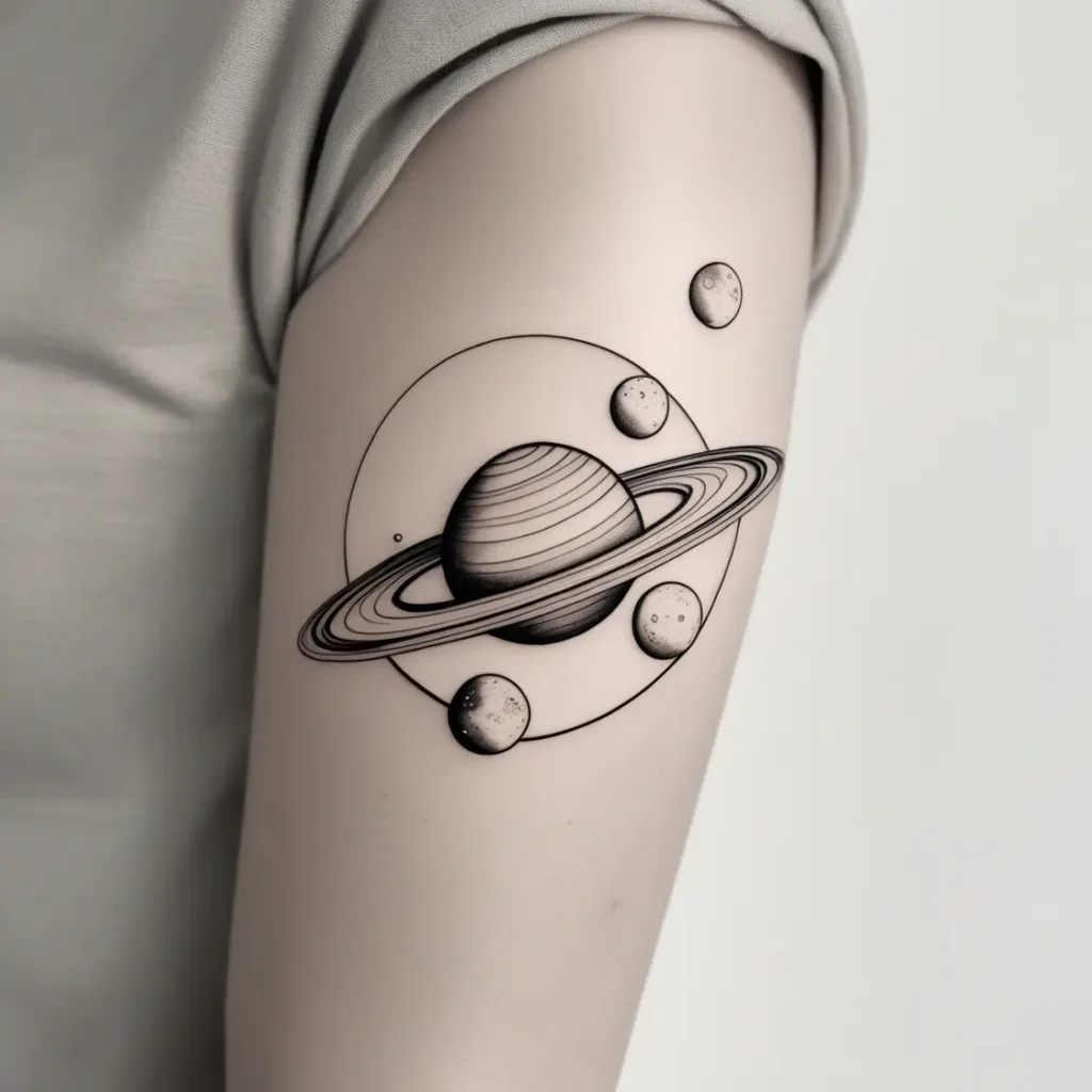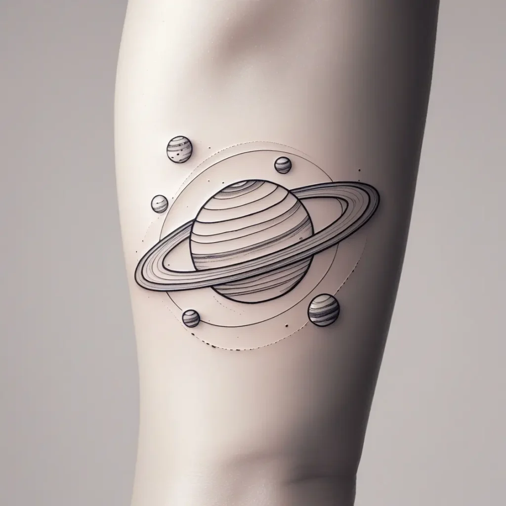 A clean, minimalistic tattoo of Saturn, complete with its stunning planetary rings. Add subtle details of nearby moons or distant stars to enhance the cosmic effect.
