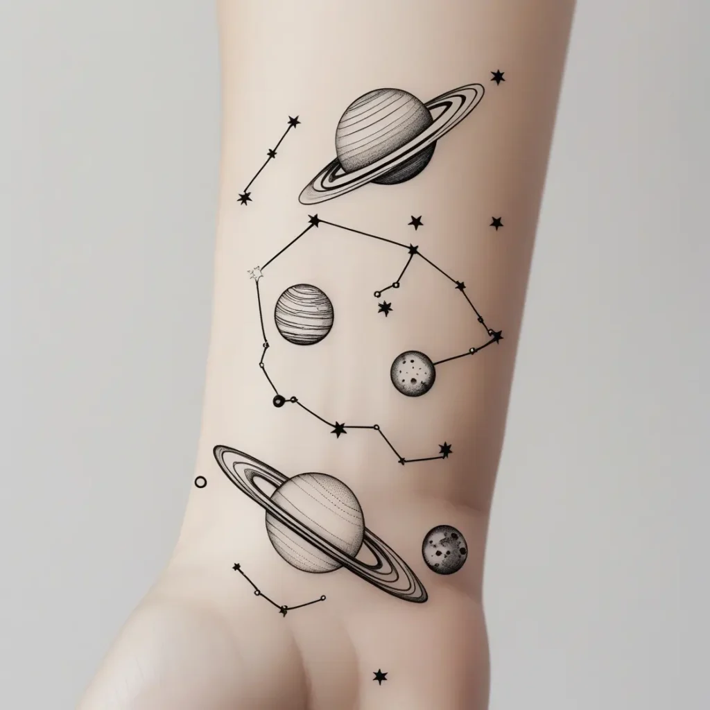 A geometric pattern featuring stars and planets aligning in a perfect formation. The tattoo could also incorporate constellations or astrological symbols to personalize the design.