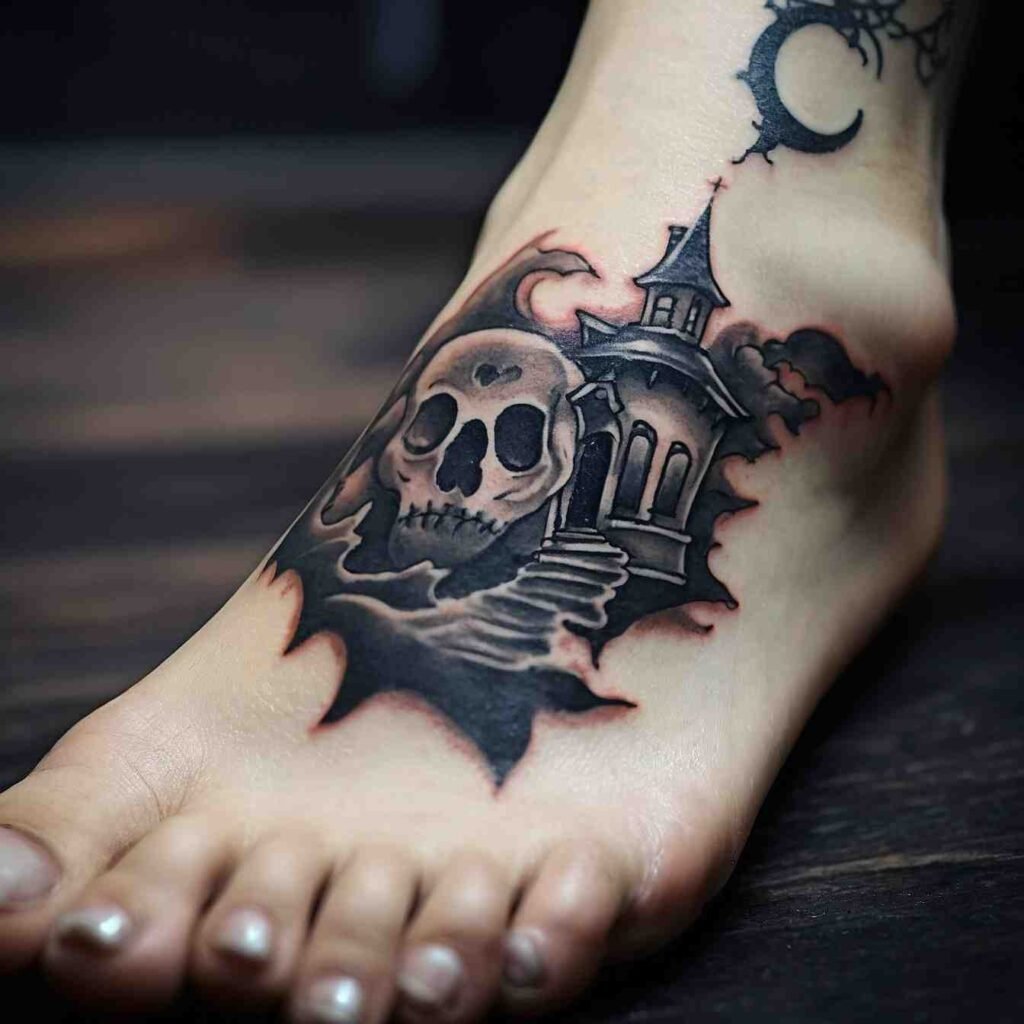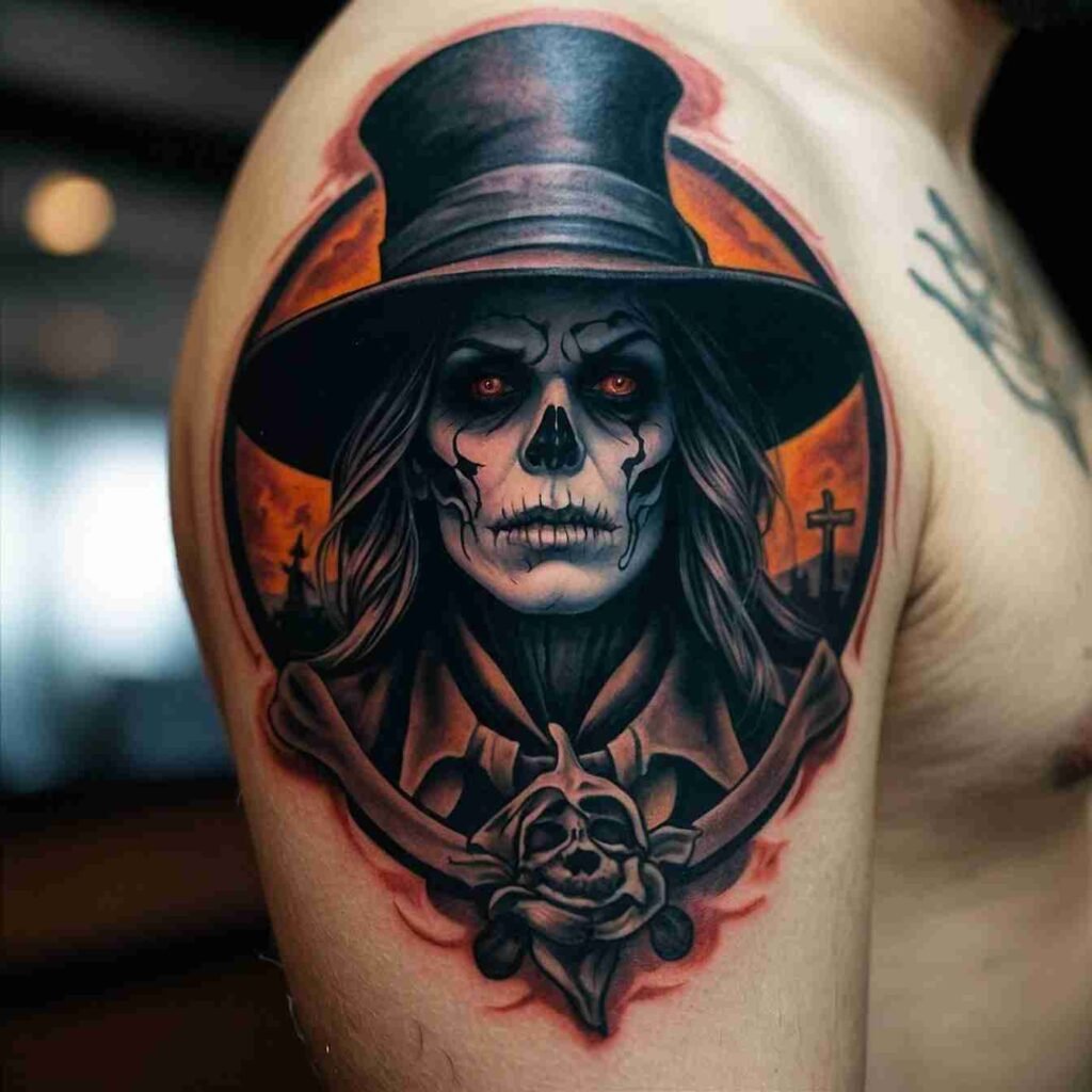This tattoo is a great way to show off your love for Halloween. It’s not just a ghost, it’s a whole haunted vibe. Plus, it’s versatile – you can go detailed or keep it simple. Either way, it’s sure to catch eyes and start conversations.