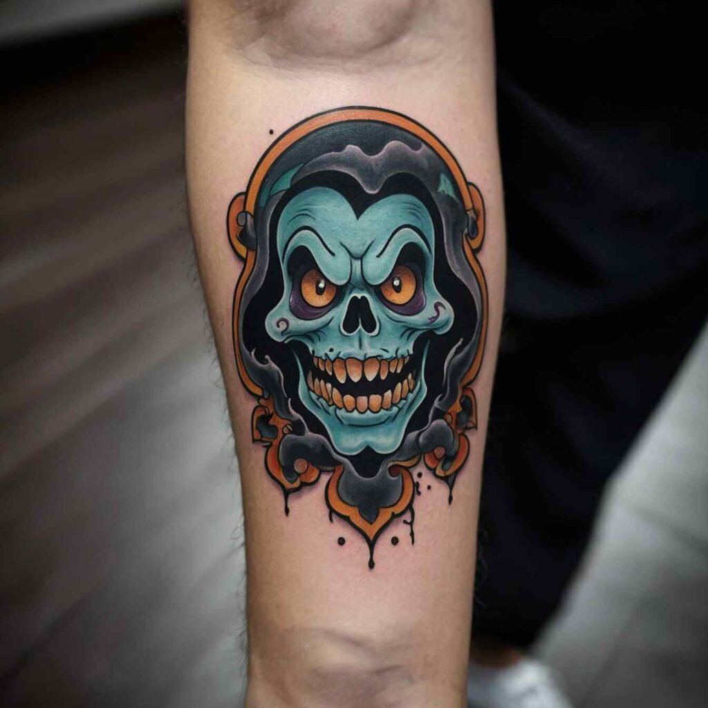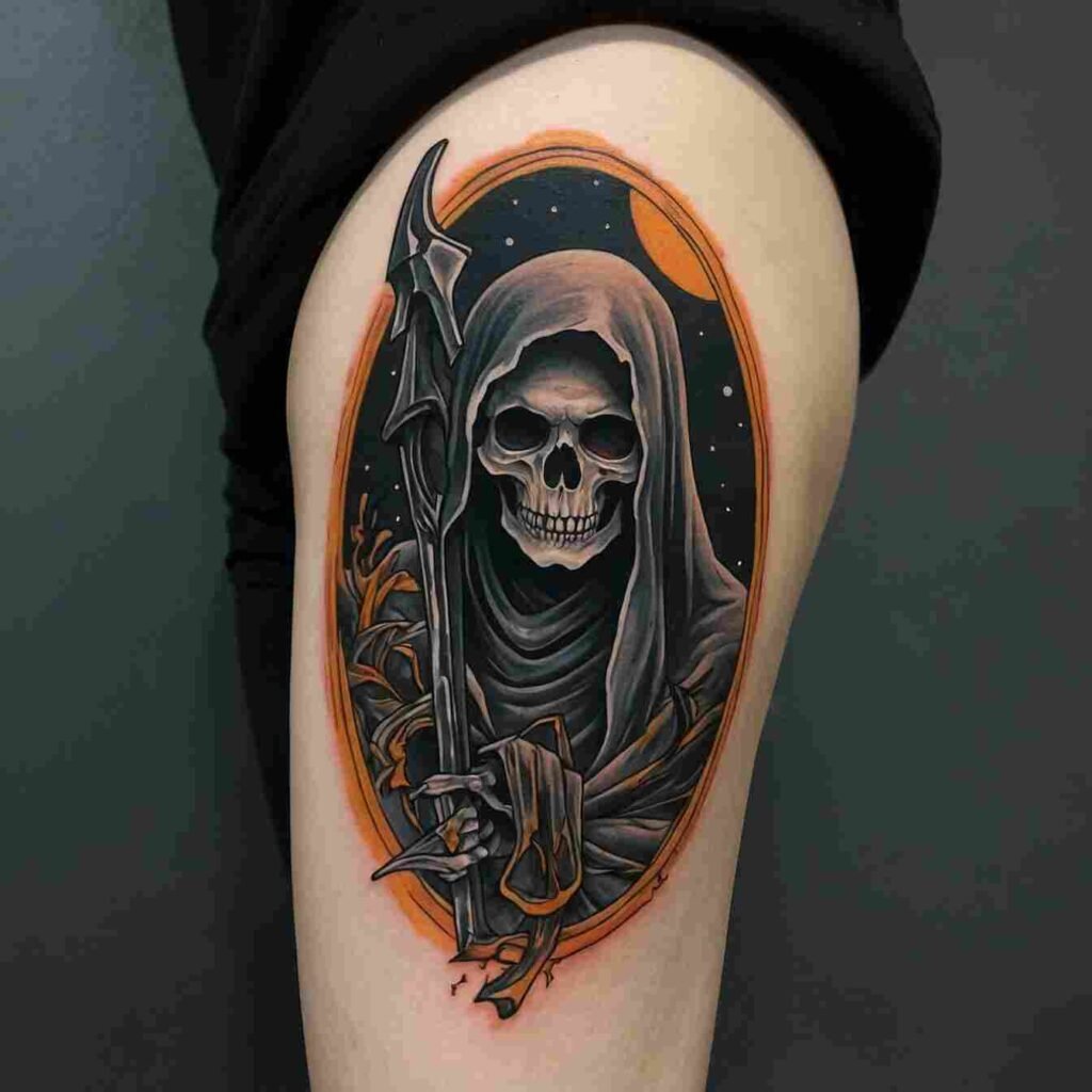 Let’s talk about a real showstopper – the ghost with a scythe tattoo. It’s like the Grim Reaper got a spooky makeover! I’m obsessed with how it looks on a bicep or thigh. This ghostly figure, scythe in hand, is both creepy and cool. It’s Halloween turned up to eleven.