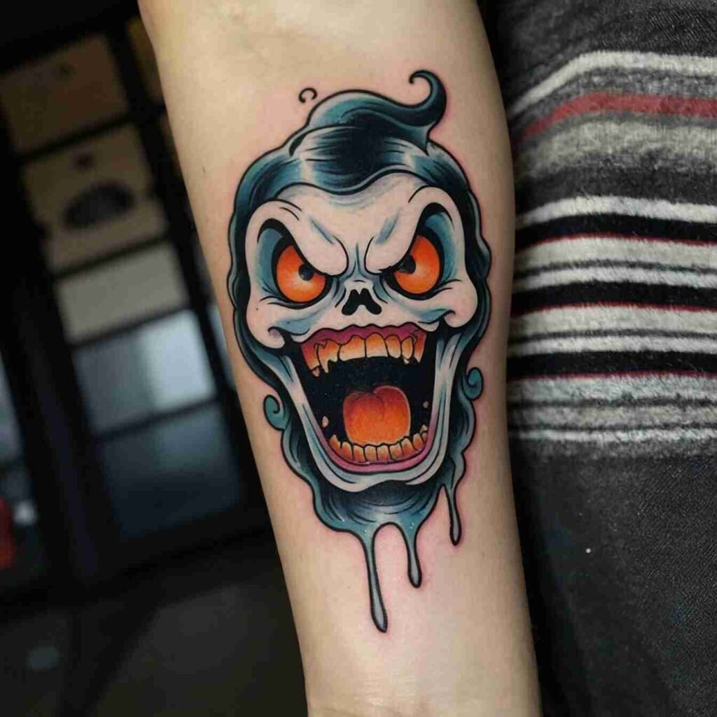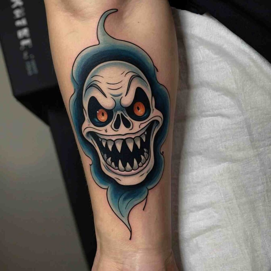 The ghost’s wispy form is both playful and unsettling, like a friendly poltergeist. This tattoo is a must for any Halloween fanatic looking for a subtle nod to the spooky season.