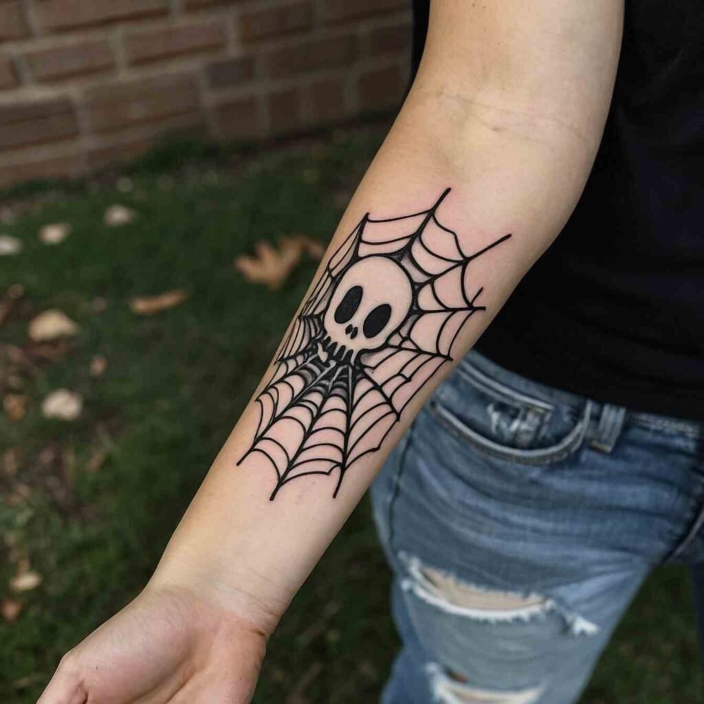 I’m obsessed with this ghostly tattoo idea! A wispy specter caught in a delicate spider web is the perfect blend of cute and creepy for Halloween. The minimalist design packs a punch with its haunting simplicity. I’d love to get this tattooed on my shoulder or back – the web’s intricate pattern would look amazing peeking out from under a tank top.
