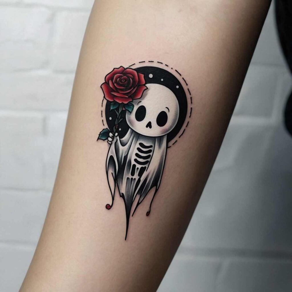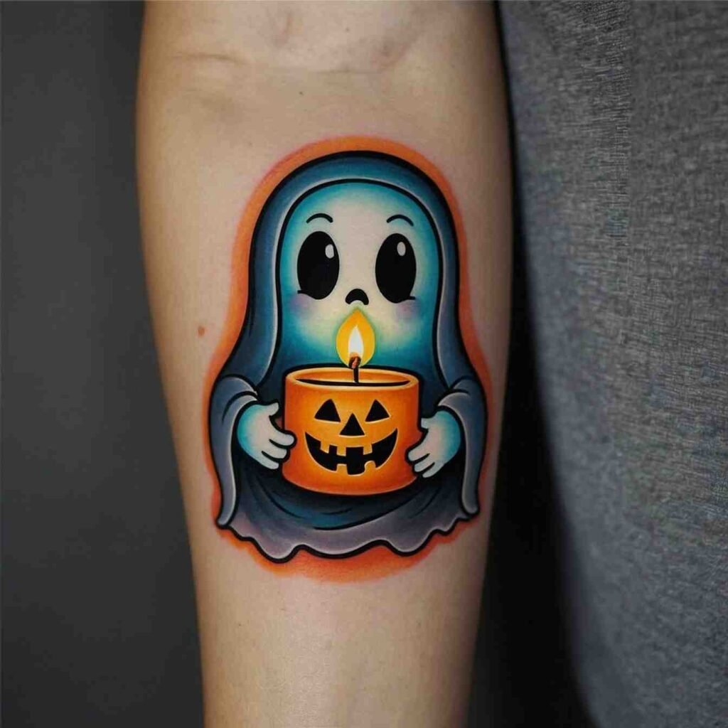 Who says ghosts have to be scary? I love the idea of a friendly ghost tattoo. This design features a cheerful, smiling ghost that’s more cute than creepy. It’s perfect if you want to embrace the Halloween spirit without the fright.