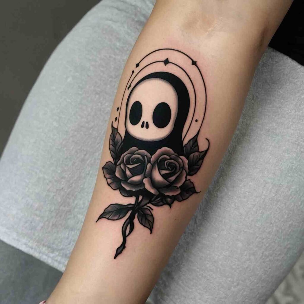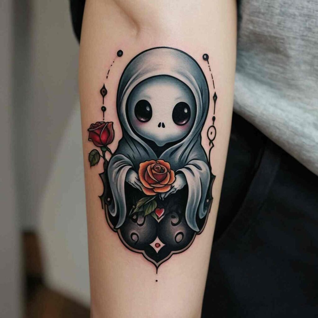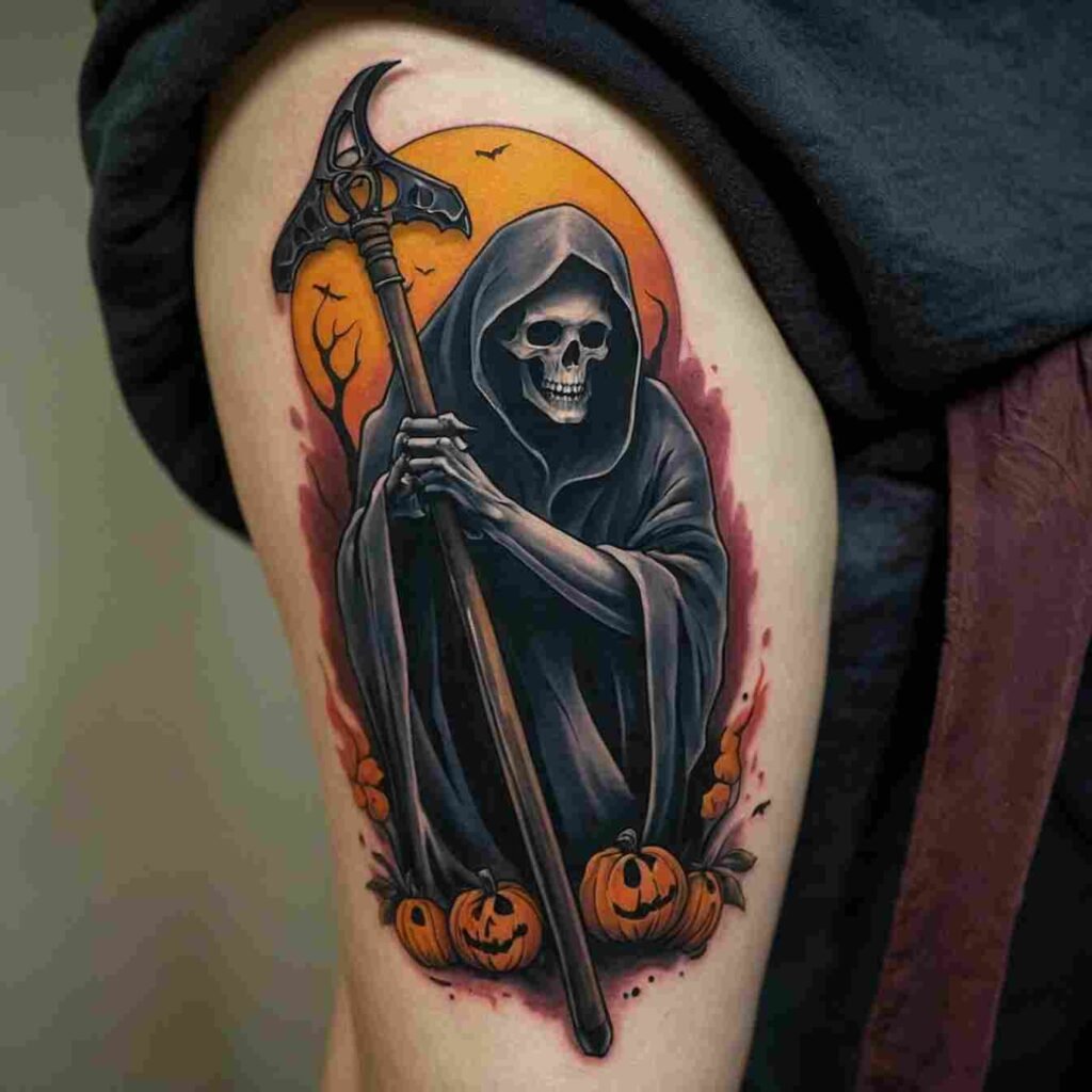 What I love most is the mix of ghost and Reaper. It’s like two Halloween icons rolled into one awesome tattoo. It’s not just spooky – it’s powerful. This design says you’re not afraid to face your fears. Plus, it looks wicked cool. Who wouldn’t want that?