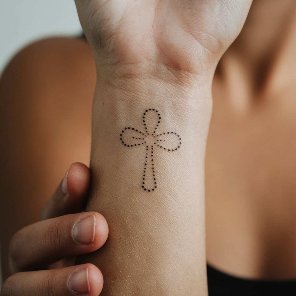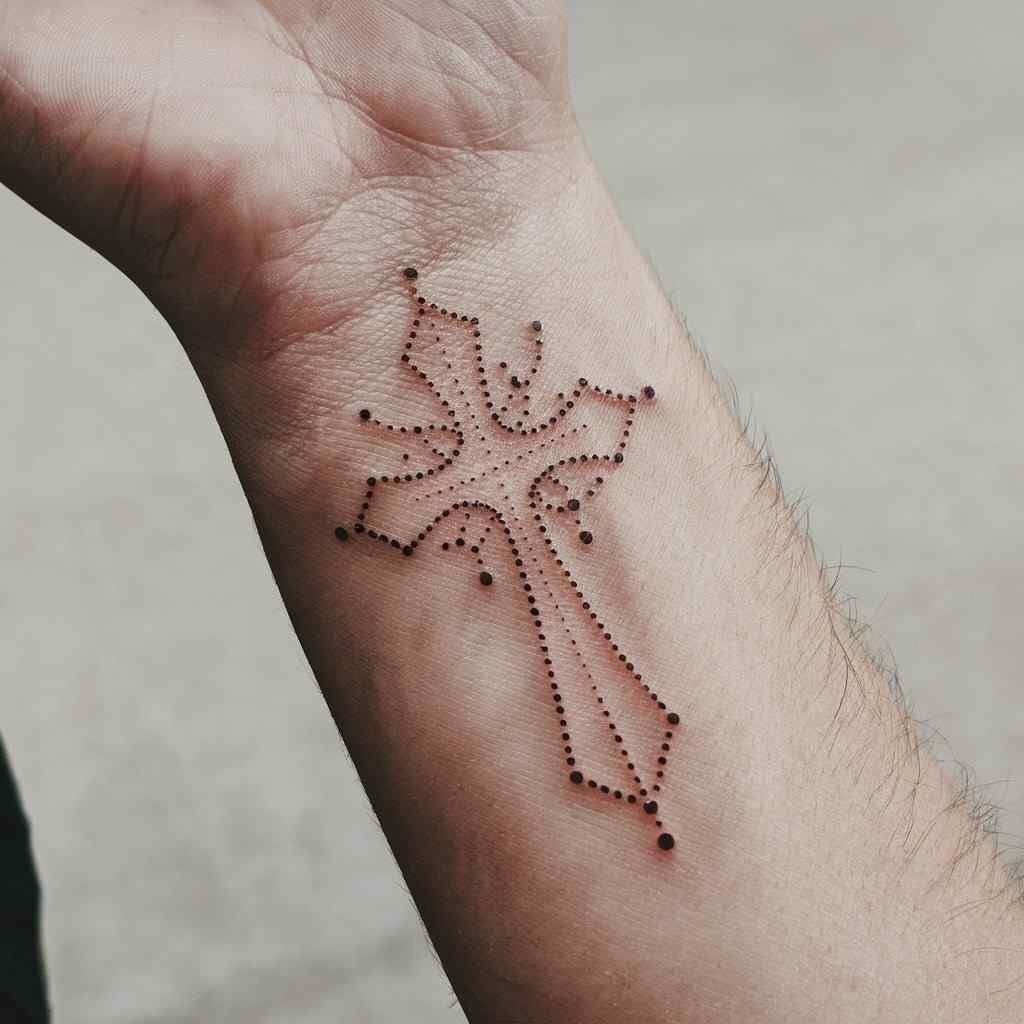 A dotted outline cross is a delicate and modern take on the traditional cross tattoo. This design is subtle, making it an excellent choice for those who prefer a more understated yet meaningful tattoo.