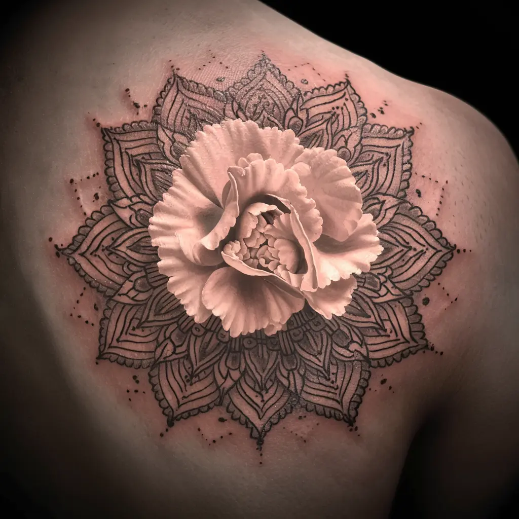 Tattoo Description: A carnation at the center of an intricate mandala pattern, with layers of petals and geometric shapes radiating outward.
