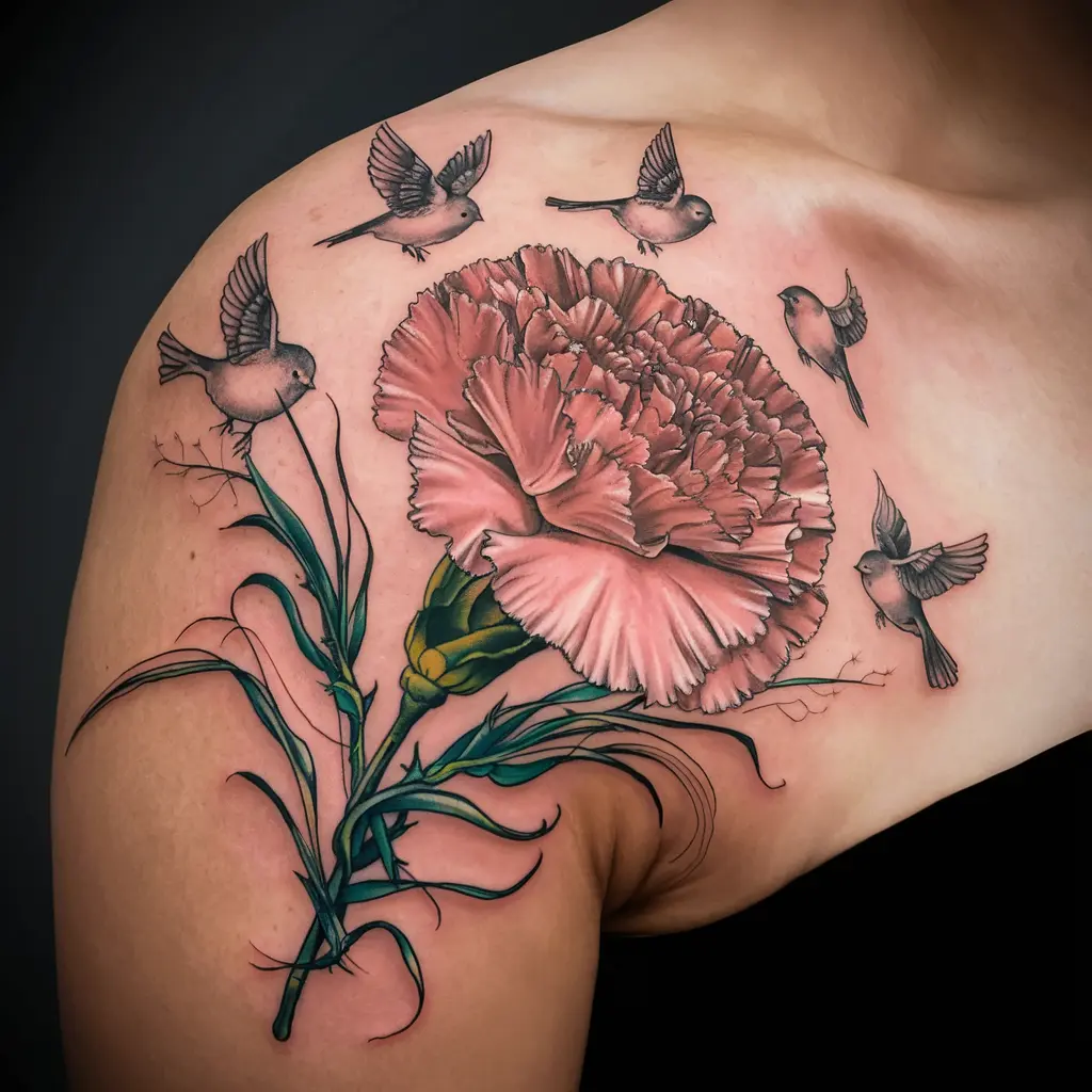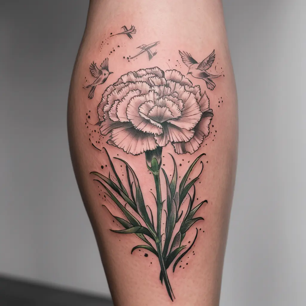 Tattoo Description: A carnation in full bloom with birds flying around it, symbolizing freedom and the start of something new.