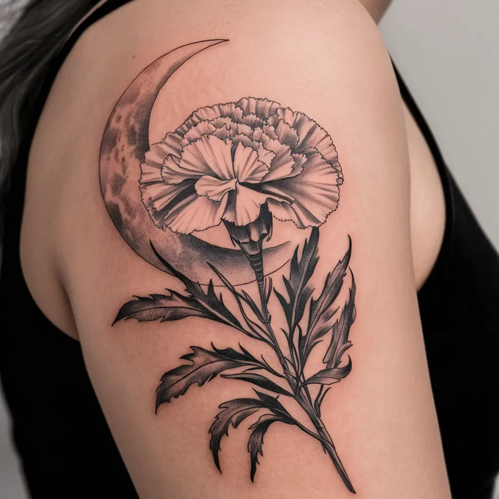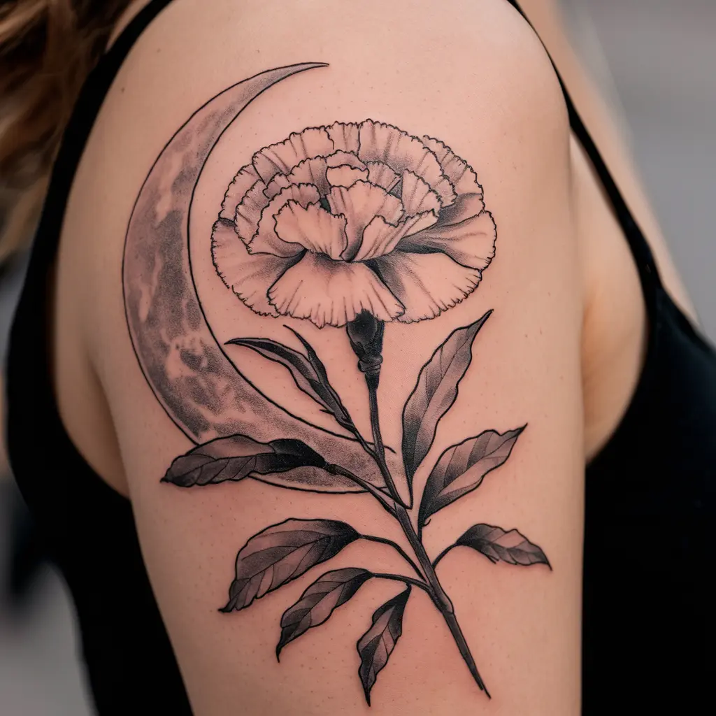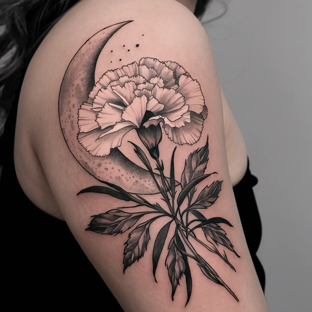 Tattoo Description: A delicate carnation paired with a crescent moon, creating a mystical and ethereal feel.