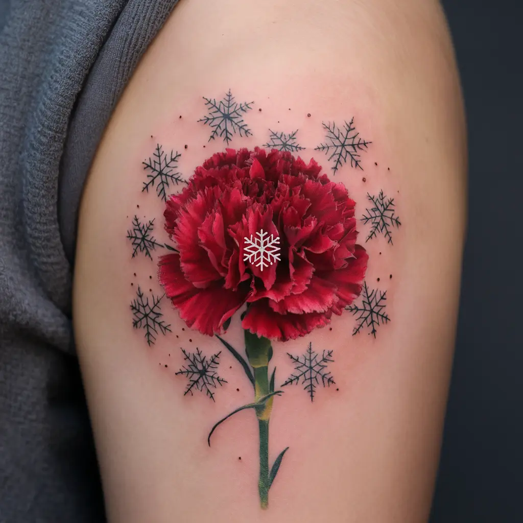 Tattoo Description: Picture a rich red carnation at the center, with tiny snowflakes scattered around it.
