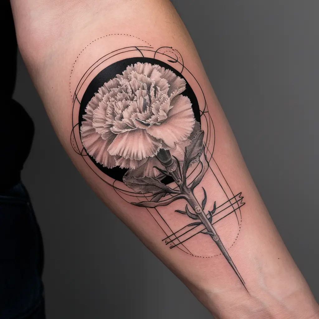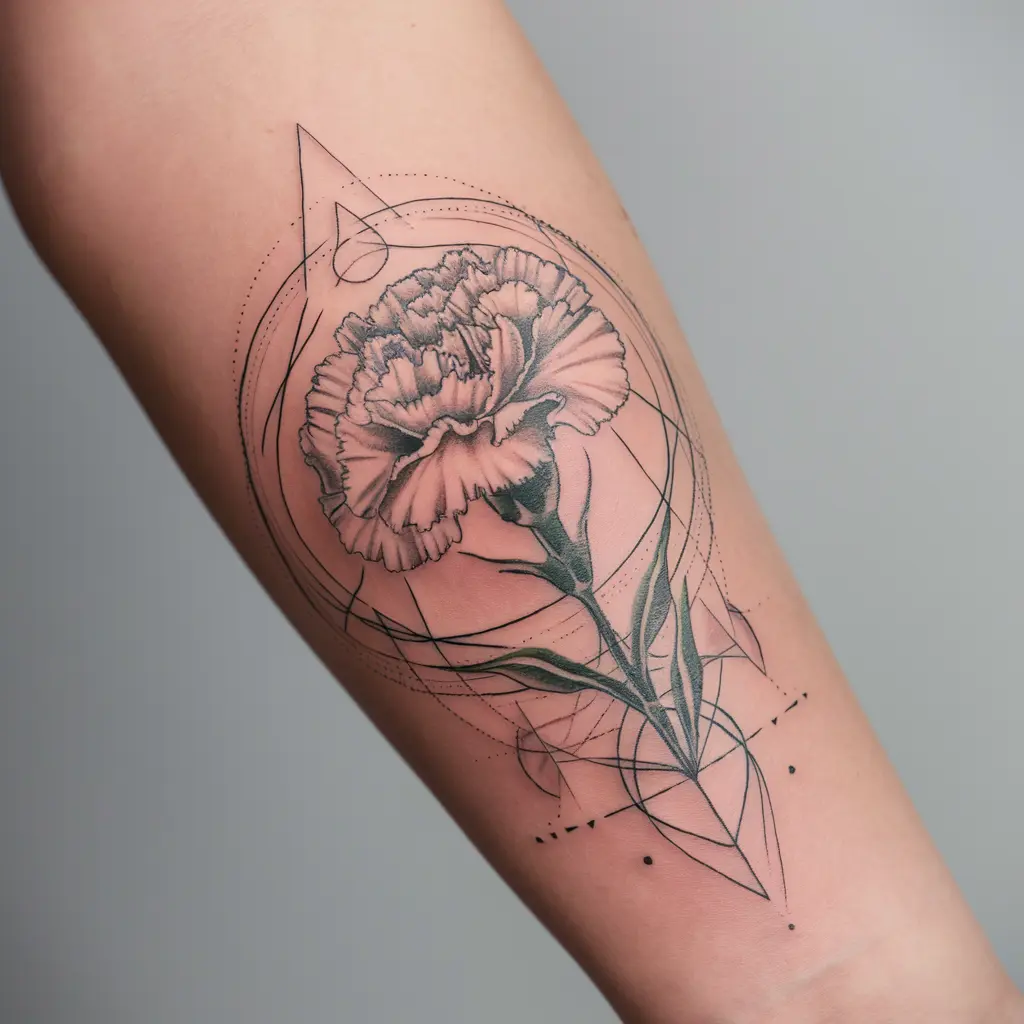 Tattoo Description: A carnation enclosed by geometric shapes like circles, triangles, or squares.