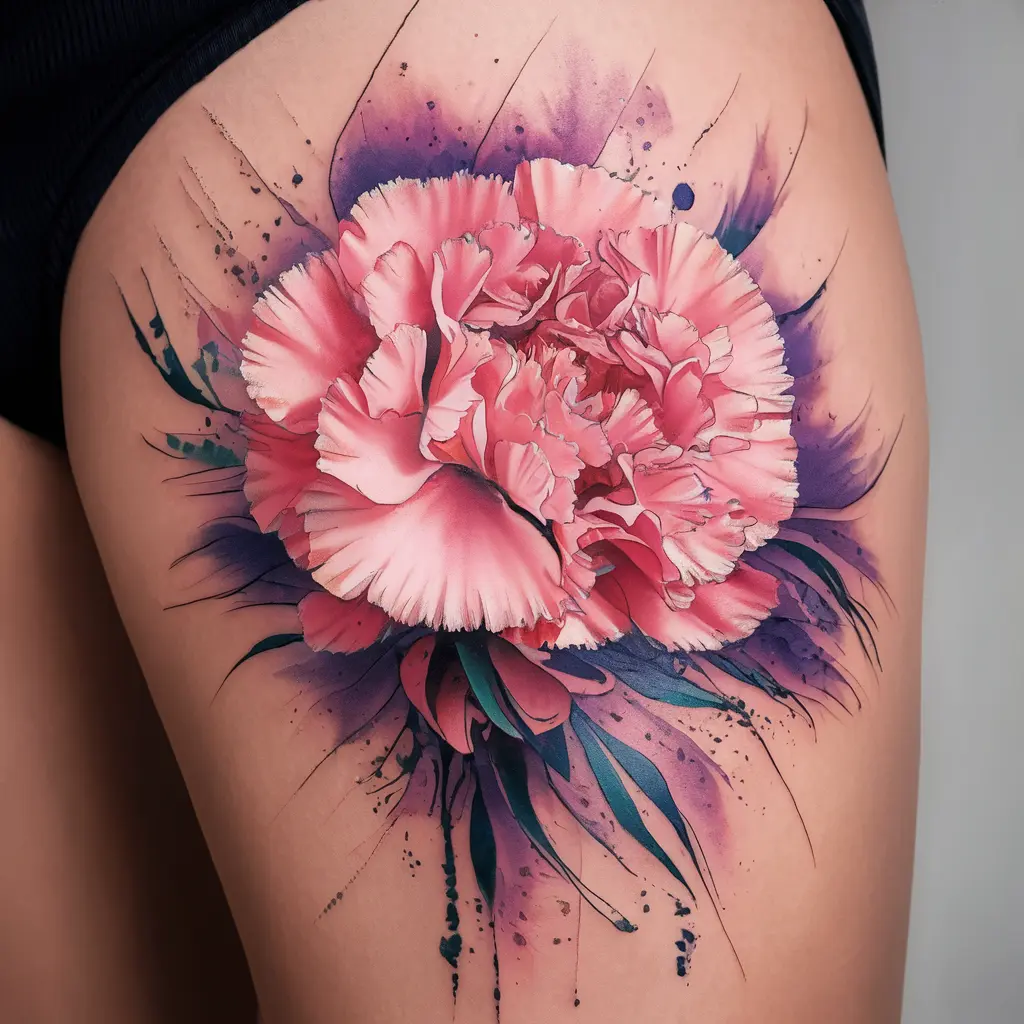 Tattoo Description: A carnation tattoo with soft, watercolor splashes in hues of pink, purple, and red.