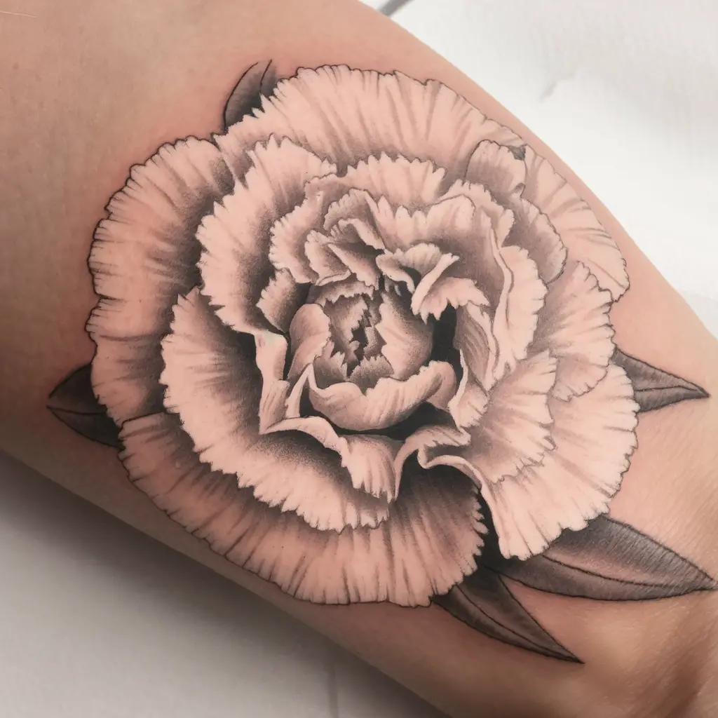 Tattoo Description: A soft-pink carnation with intricate petals. The petals curl delicately, showing off the flower’s natural beauty.