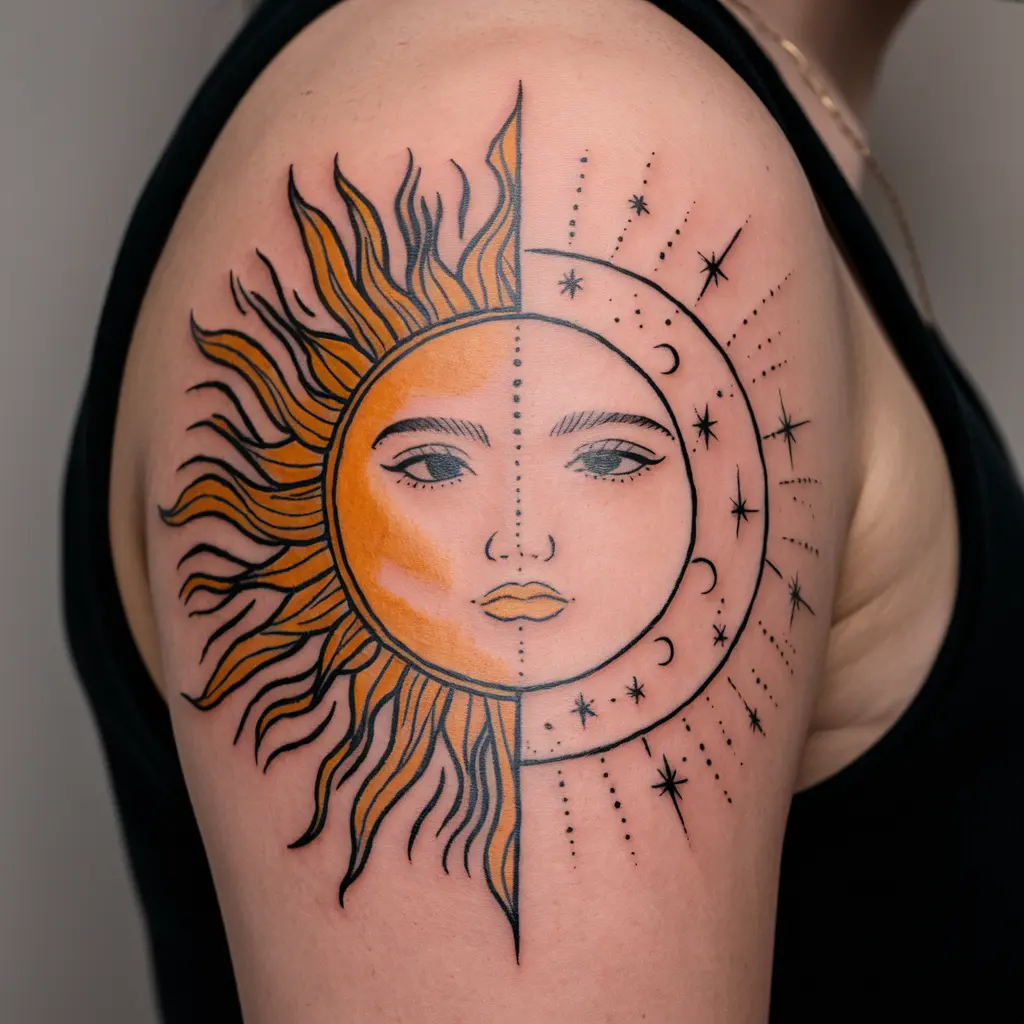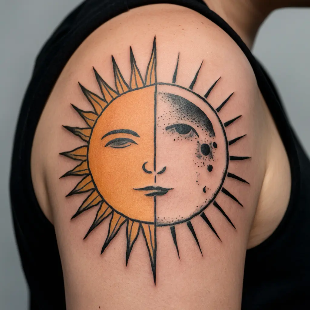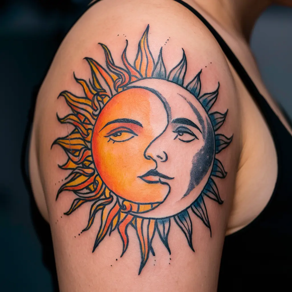 A sun and moon tattoo represents balance and duality, and it’s also a beautiful artistic design that looks great as a first tattoo. It symbolizes the harmony between light and dark, day and night, and the cyclical nature of life.