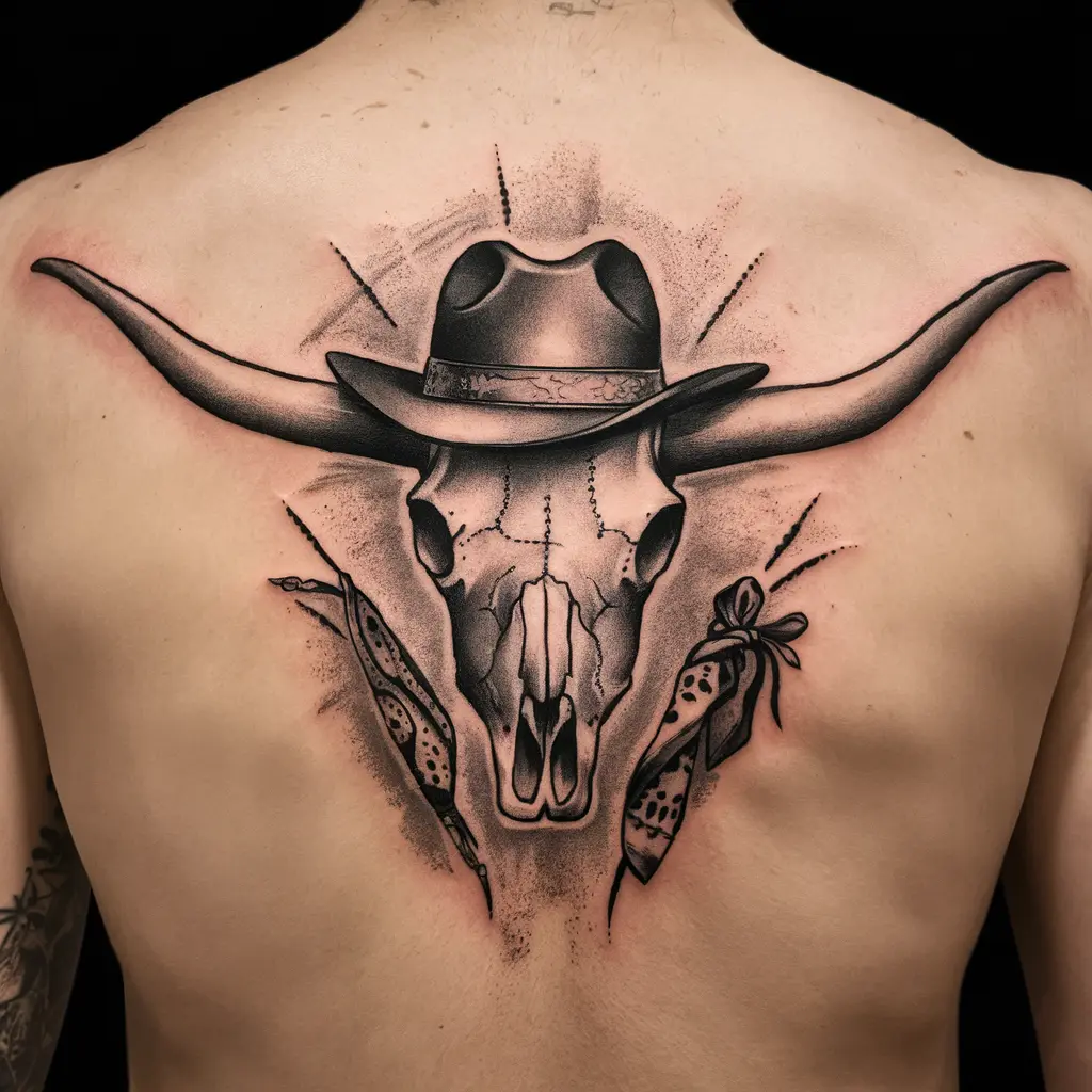 This tattoo takes the longhorn skull to a true Western level, complete with cowboy hats, bandanas, and other Western elements. It’s perfect for anyone who has a connection to the cowboy lifestyle or enjoys a classic Western aesthetic.