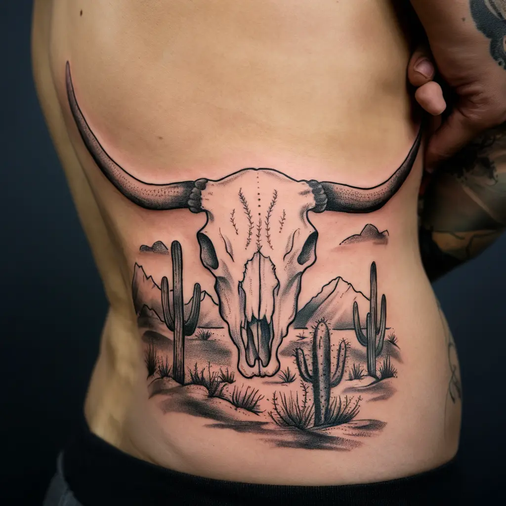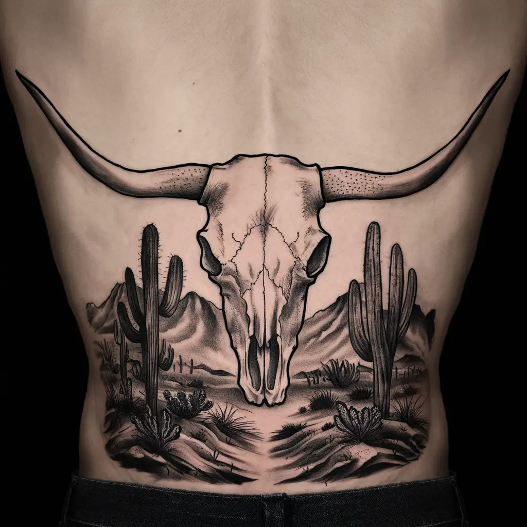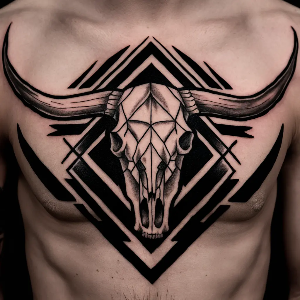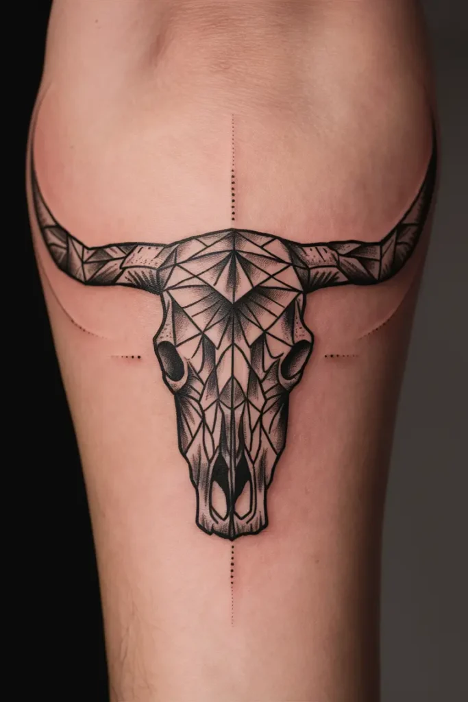 If you prefer a more modern approach, a geometric longhorn skull tattoo offers a unique, minimalist look. The sharp lines and symmetrical shapes make this design stand out while maintaining the essence of the traditional skull.