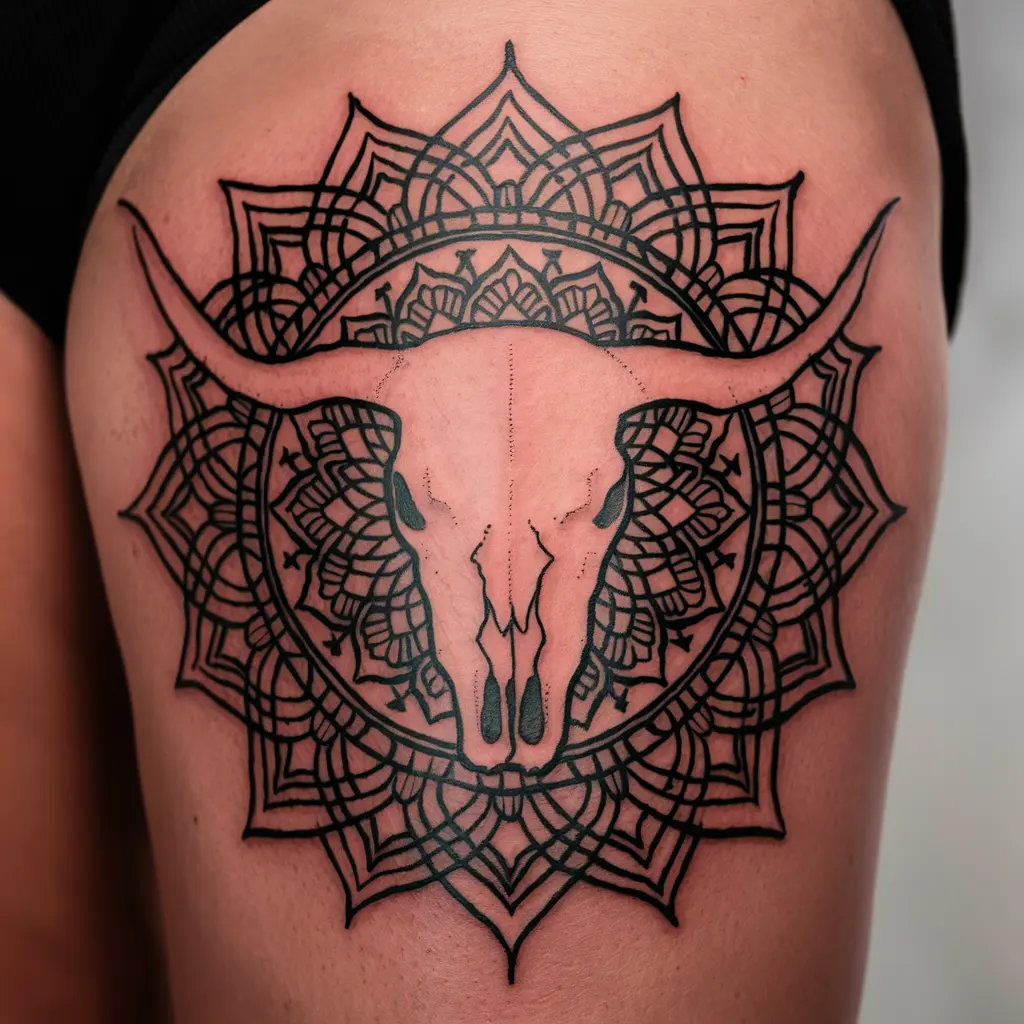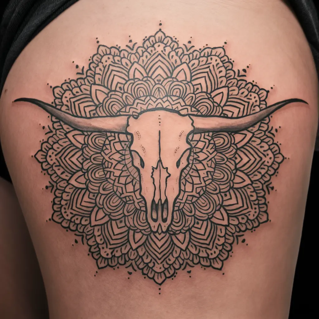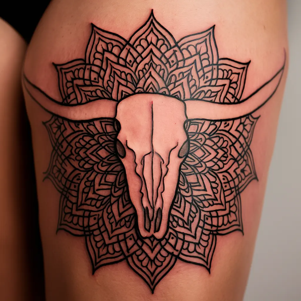 Imagine a longhorn skull surrounded by intricate mandala patterns. The mandala represents balance, unity, and the cyclical nature of life, while the skull embodies strength and survival.