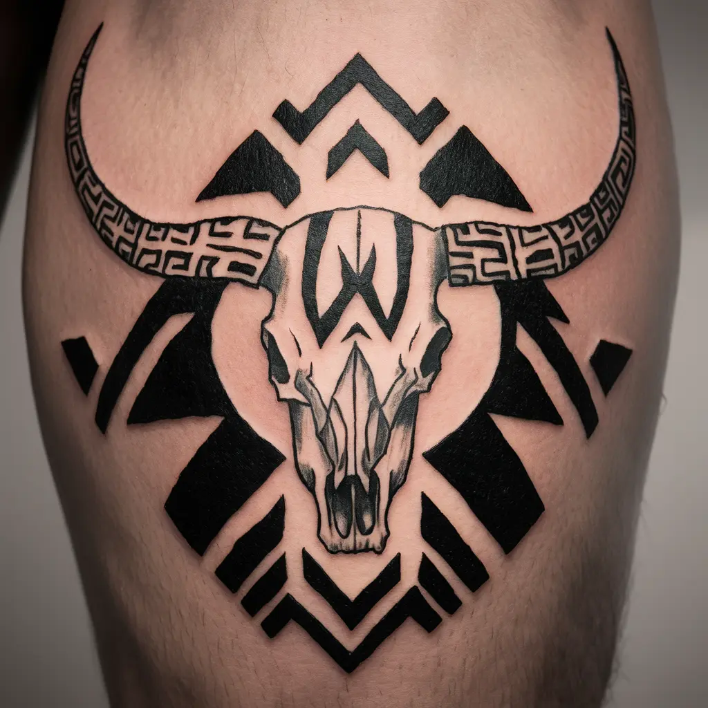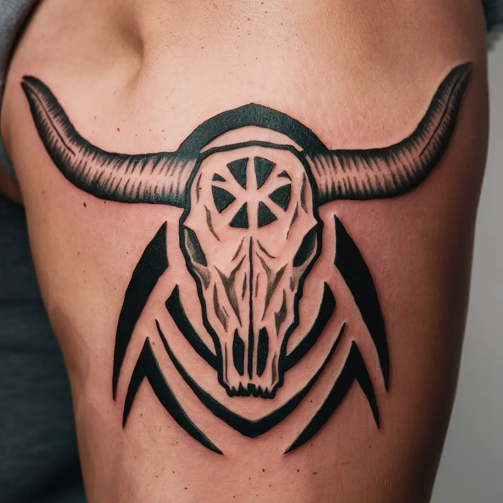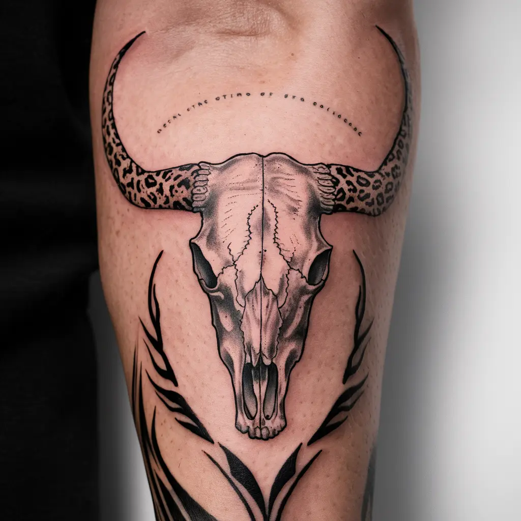 Meaning: Tribal tattoos often represent heritage and connection to nature, while the longhorn skull stands for strength and endurance.