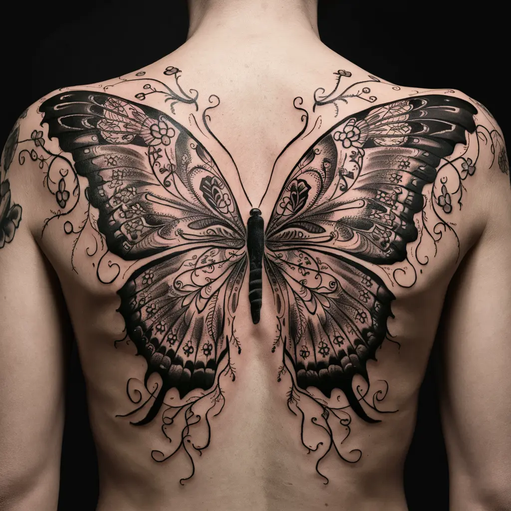 A full-back tattoo of butterfly wings spread wide across your back is delicate and stunning. The wings can be filled with intricate details and vibrant colors, giving you an ethereal, graceful look.