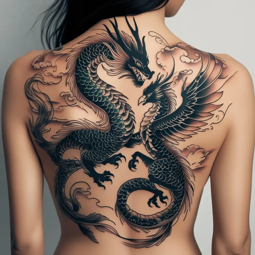 The dragon and phoenix represent a harmonious balance of opposing forces—strength and rebirth. This bold design covers the entire back, with the dragon on one side and the phoenix on the other, intertwining in an elegant way.