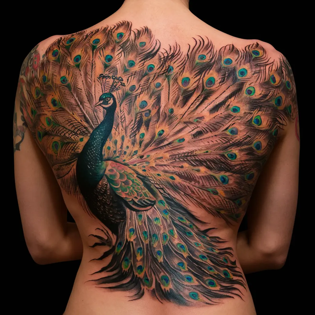 A peacock with fanned feathers across your back is a gorgeous way to show off your confidence. The vivid colors and elegant design draw attention, making it an eye-catching tattoo choice.
