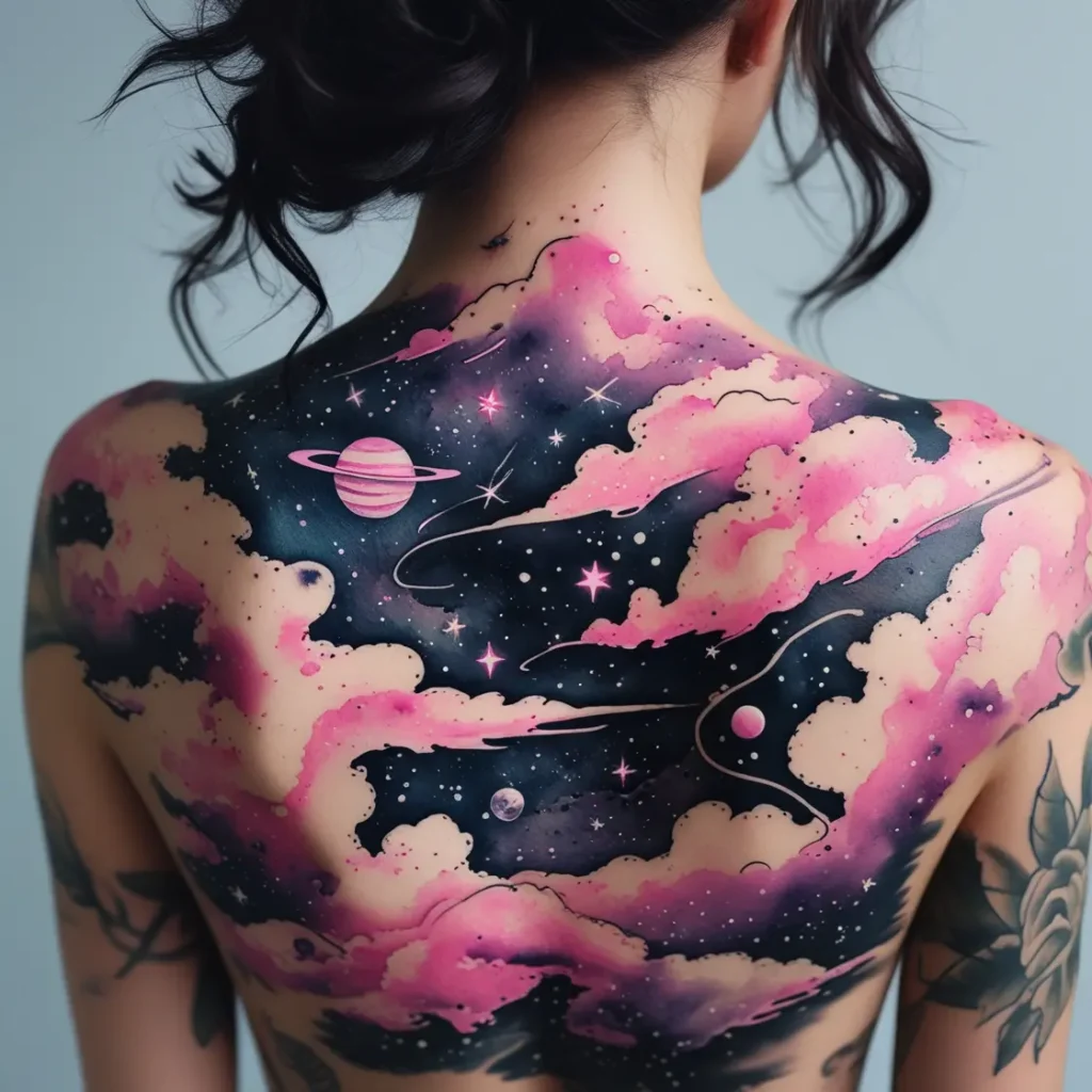 Imagine a cosmic scene in soft watercolor shades spread across your back. This tattoo can include stars, nebulas, and planets in shades of blue, purple, and pink. It’s dreamy and full of vibrant energy.