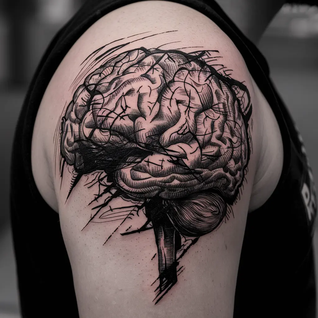 A brain tattoo with abstract lines or sections is a creative way to represent the scattered, sometimes disorganized thoughts in an overthinker’s mind. It’s the perfect mix of mental and artistic representation.