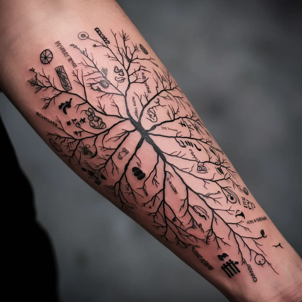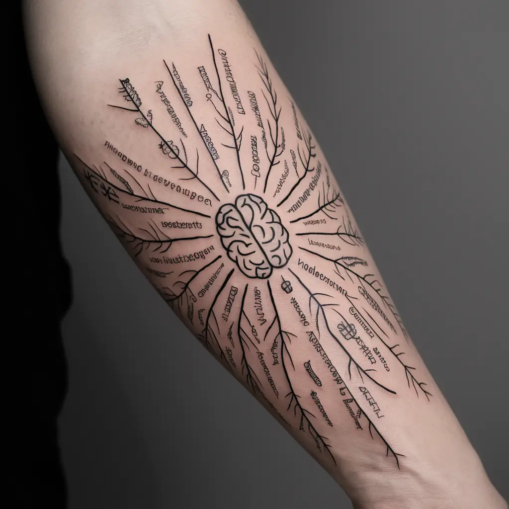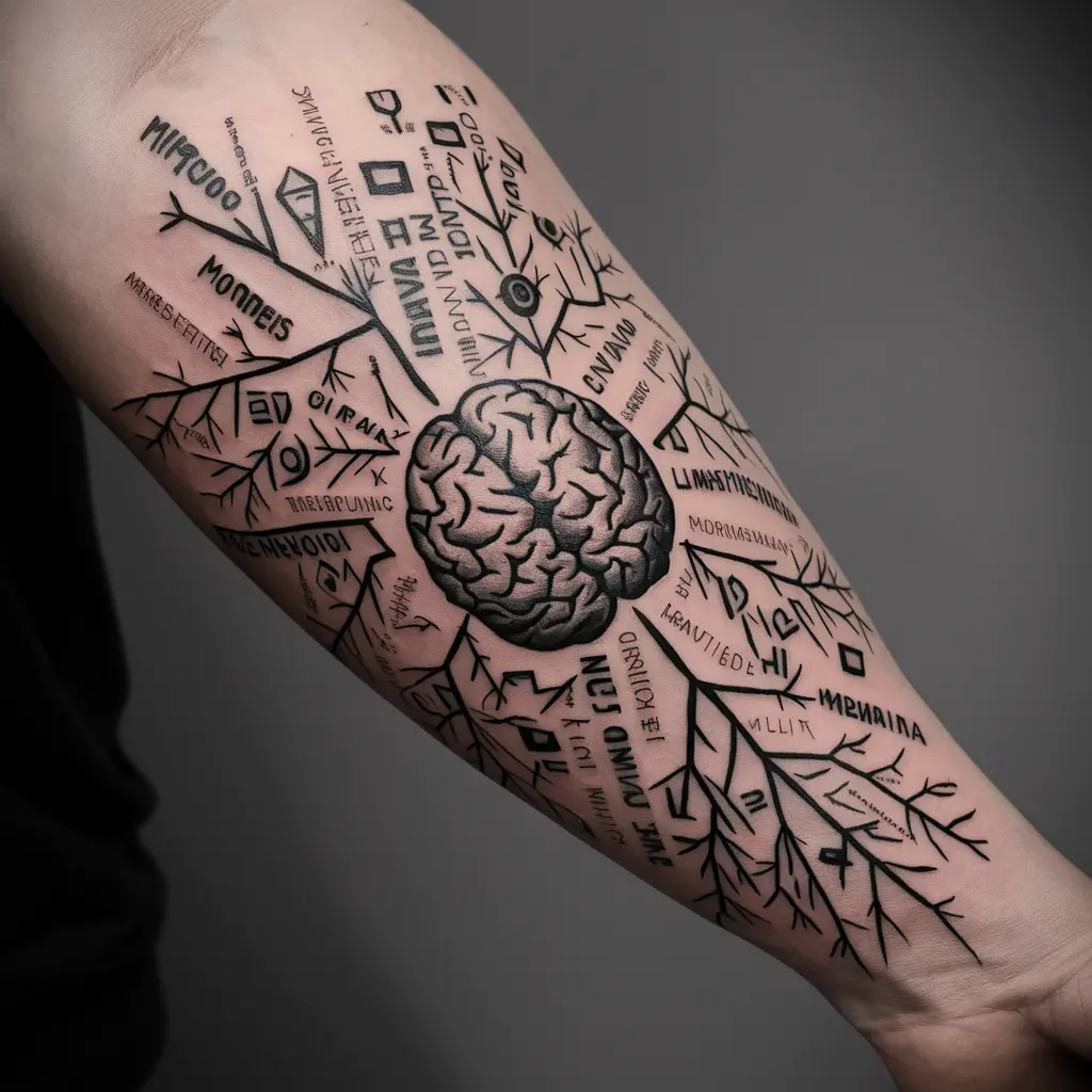 A mind map tattoo is a literal representation of the way an overthinker’s brain works. It shows how one thought leads to another, expanding into a web of ideas, worries, and reflections.