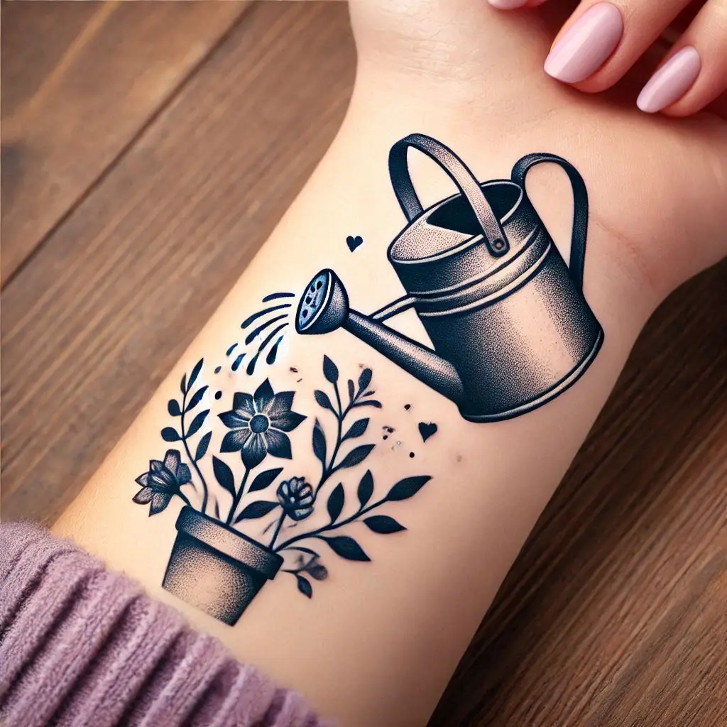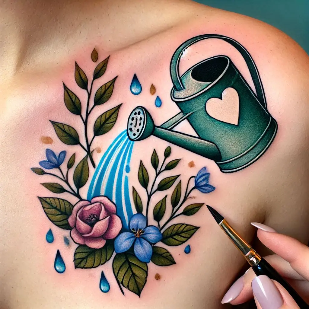 A tattoo of a watering can pouring water onto blooming flowers symbolizes my dad’s nurturing presence in my life.