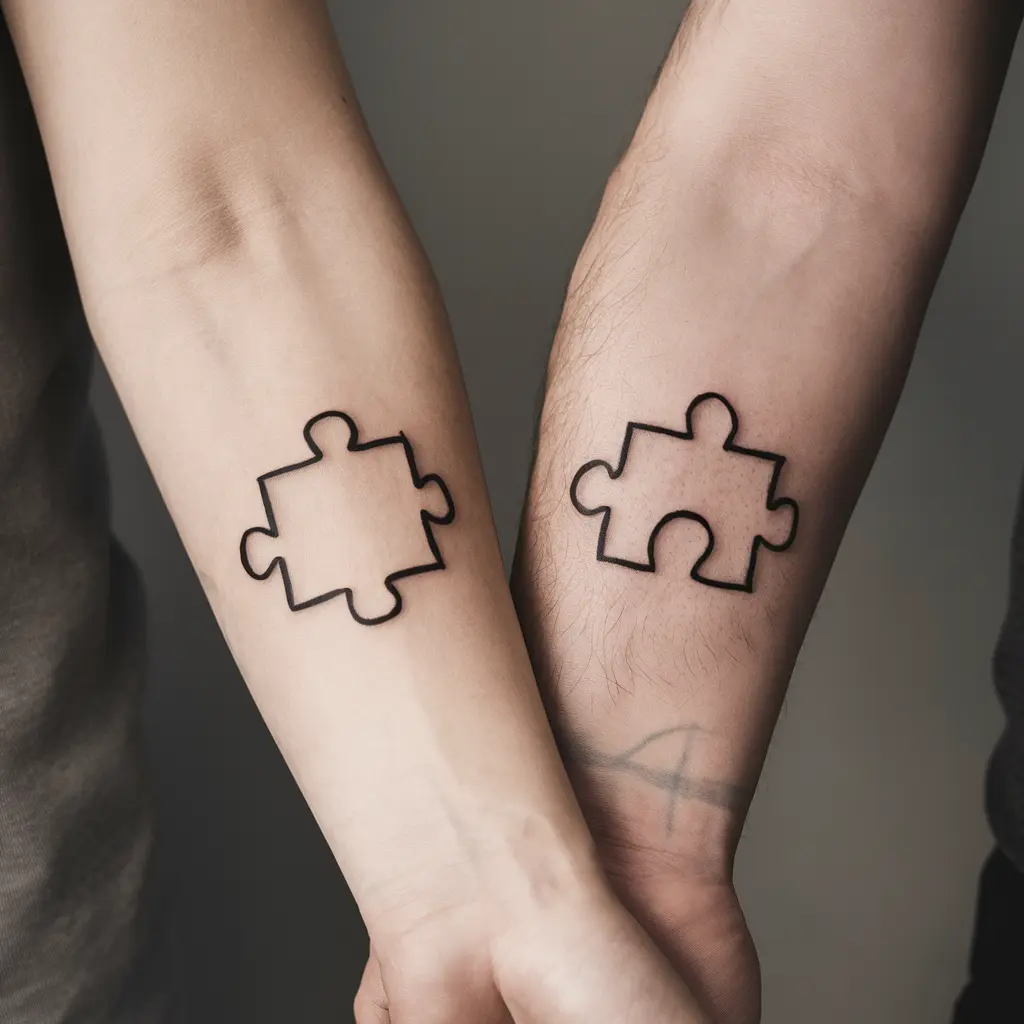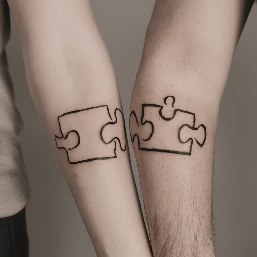 A puzzle piece tattoo symbolizes that you and your partner are two pieces of a whole. When together, you complete each other. You could get one piece of the puzzle on your tattoo and your partner could get the other.