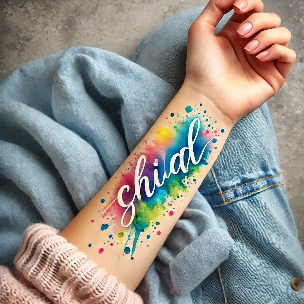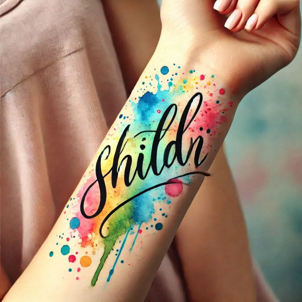Your child’s name written in delicate script with a colorful watercolor splash behind it.