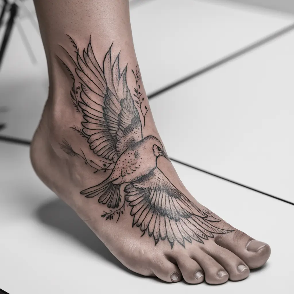 Feather: Feathers are a classic symbol of freedom, courage, and lightness. They are often chosen by those who feel connected to the idea of independence or spiritual elevation. A feather tattoo on the foot can represent moving lightly through life, embracing freedom with each step.