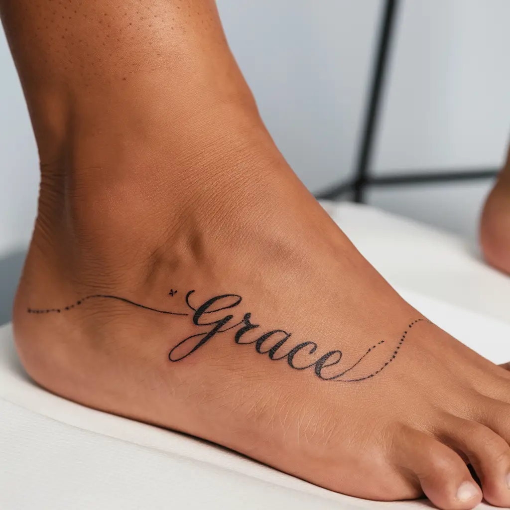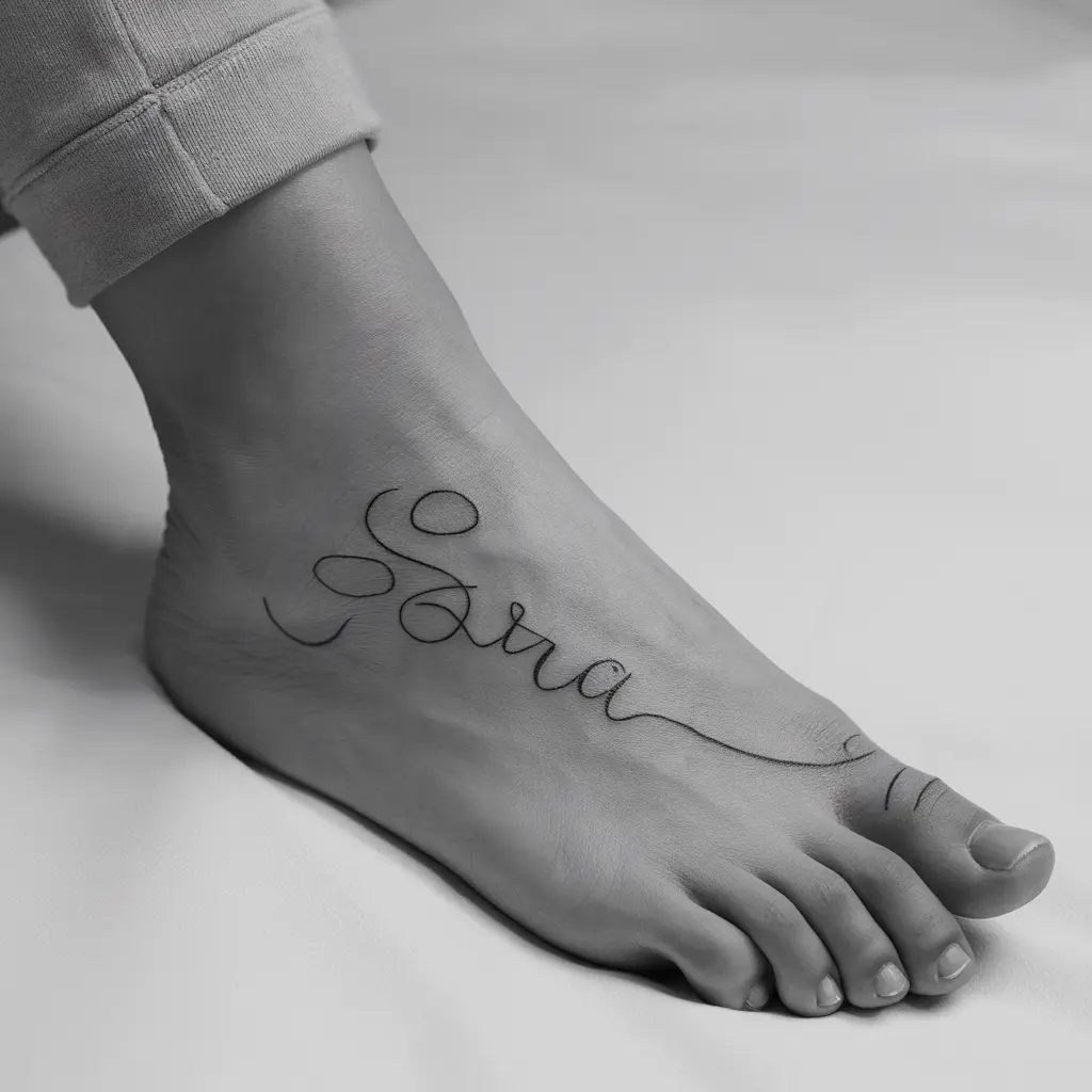 Names: Many choose to tattoo a loved one’s name on their foot as a reminder of someone special, whether it’s a family member, child, or partner. Names are often written in elegant scripts to add a personal, stylish touch.