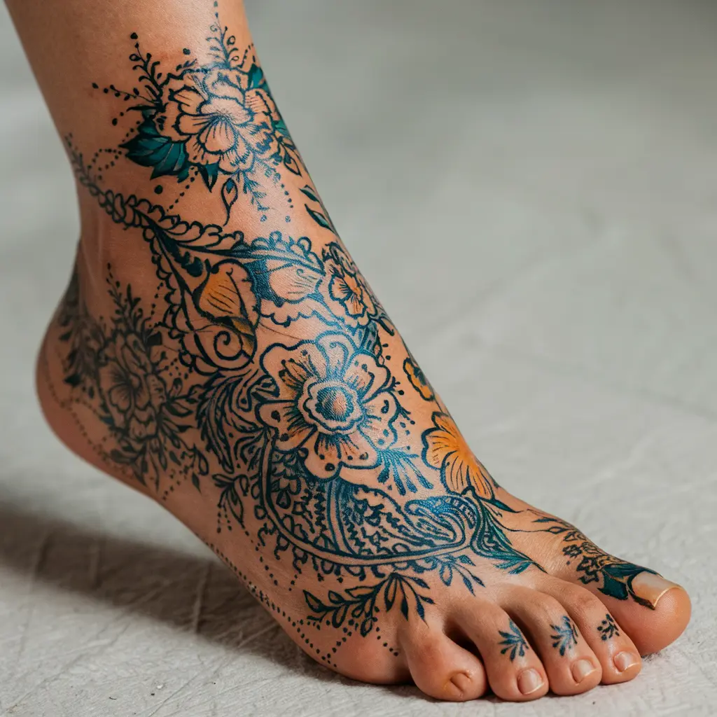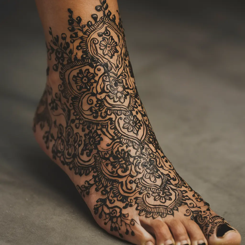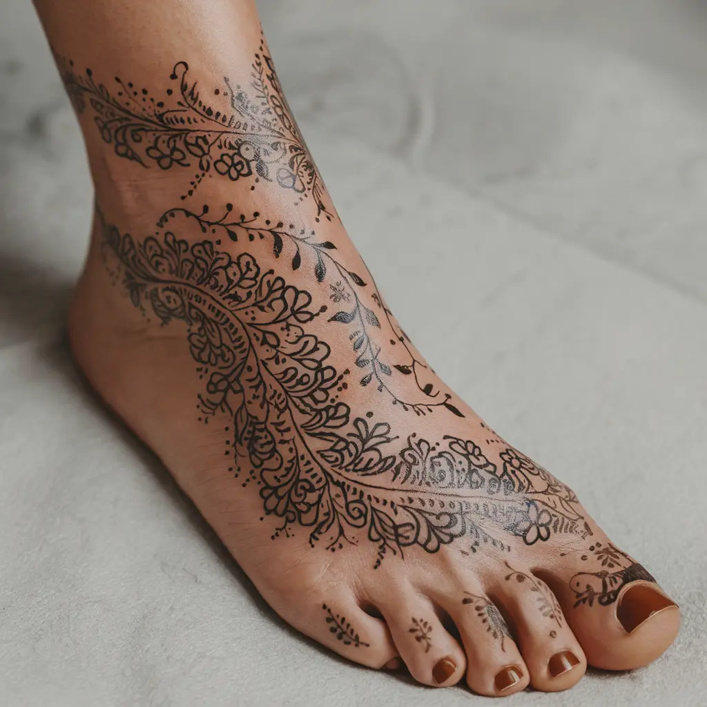 Henna-Inspired Patterns: These intricate, flowing designs often wrap around the top or sides of the foot and toes, embodying beauty, tradition, and personal artistry. Henna-inspired tattoos add a mystical and feminine flair, perfect for those who appreciate detailed, elaborate designs.