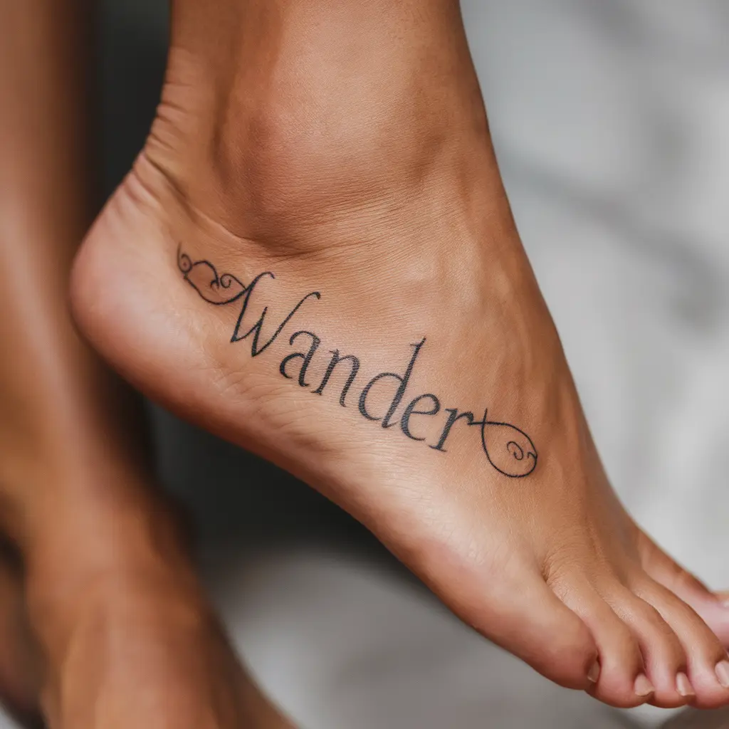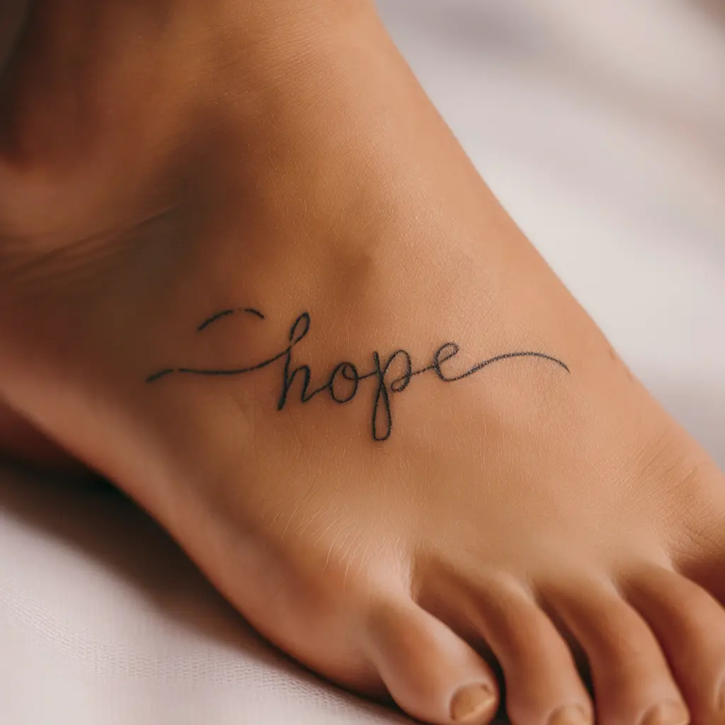 Single Words: Words like “hope,” “strength,” “wander,” or “grace” are often tattooed on the side or top of the foot. These single-word tattoos serve as daily reminders of qualities or aspirations.