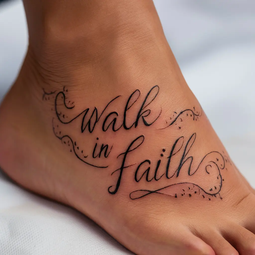 Script tattoos on the feet often feature a meaningful word, quote, or name, offering a simple and elegant design that carries personal significance.