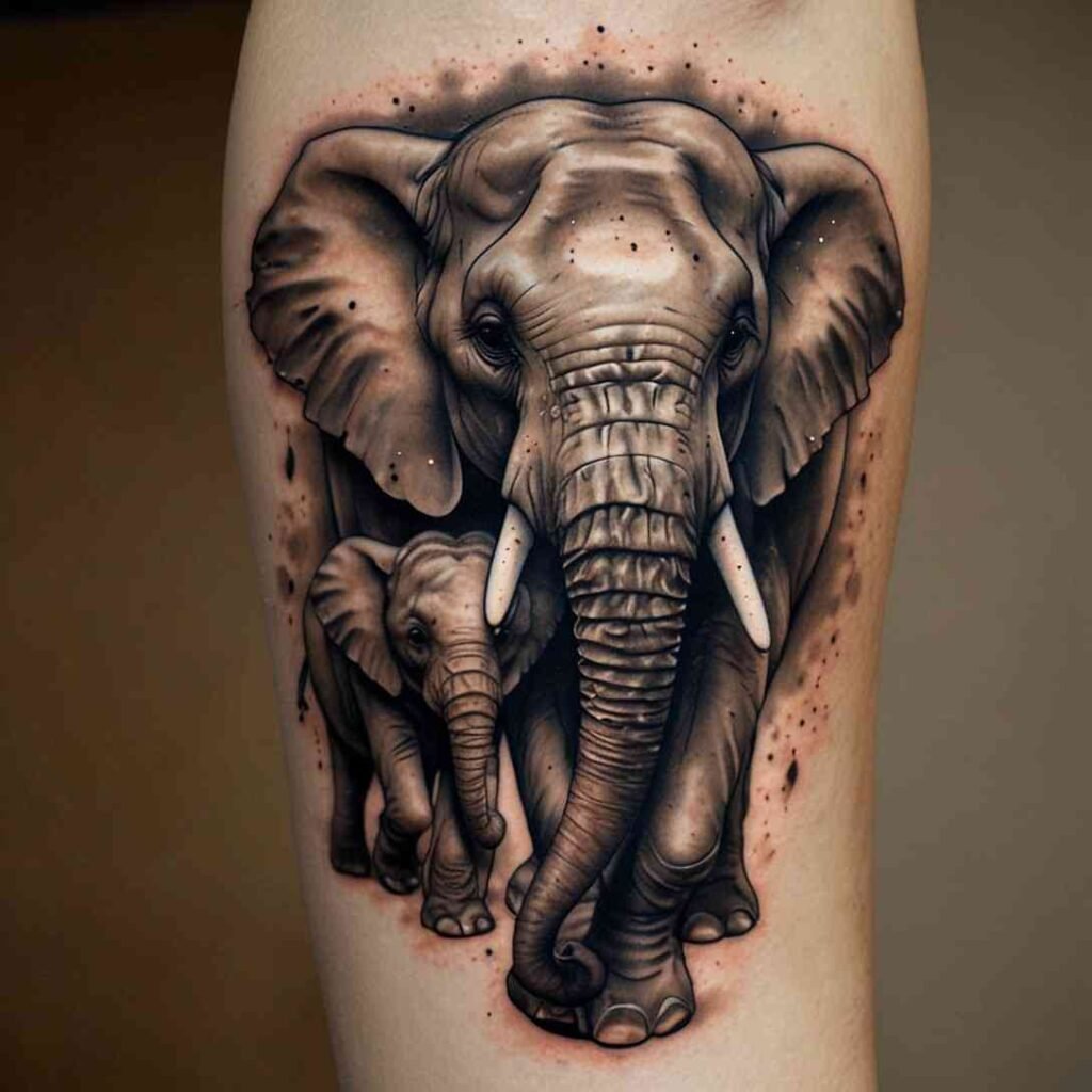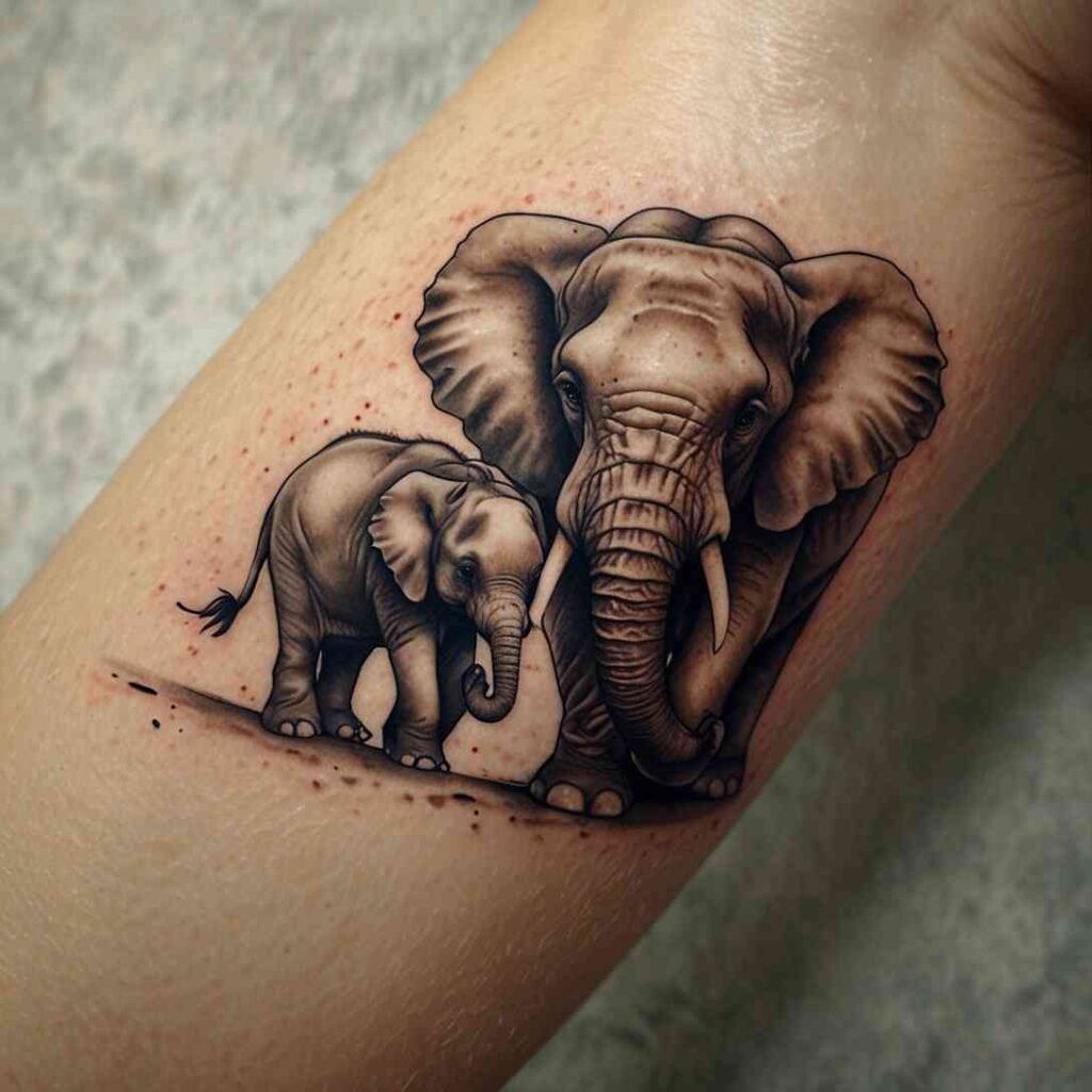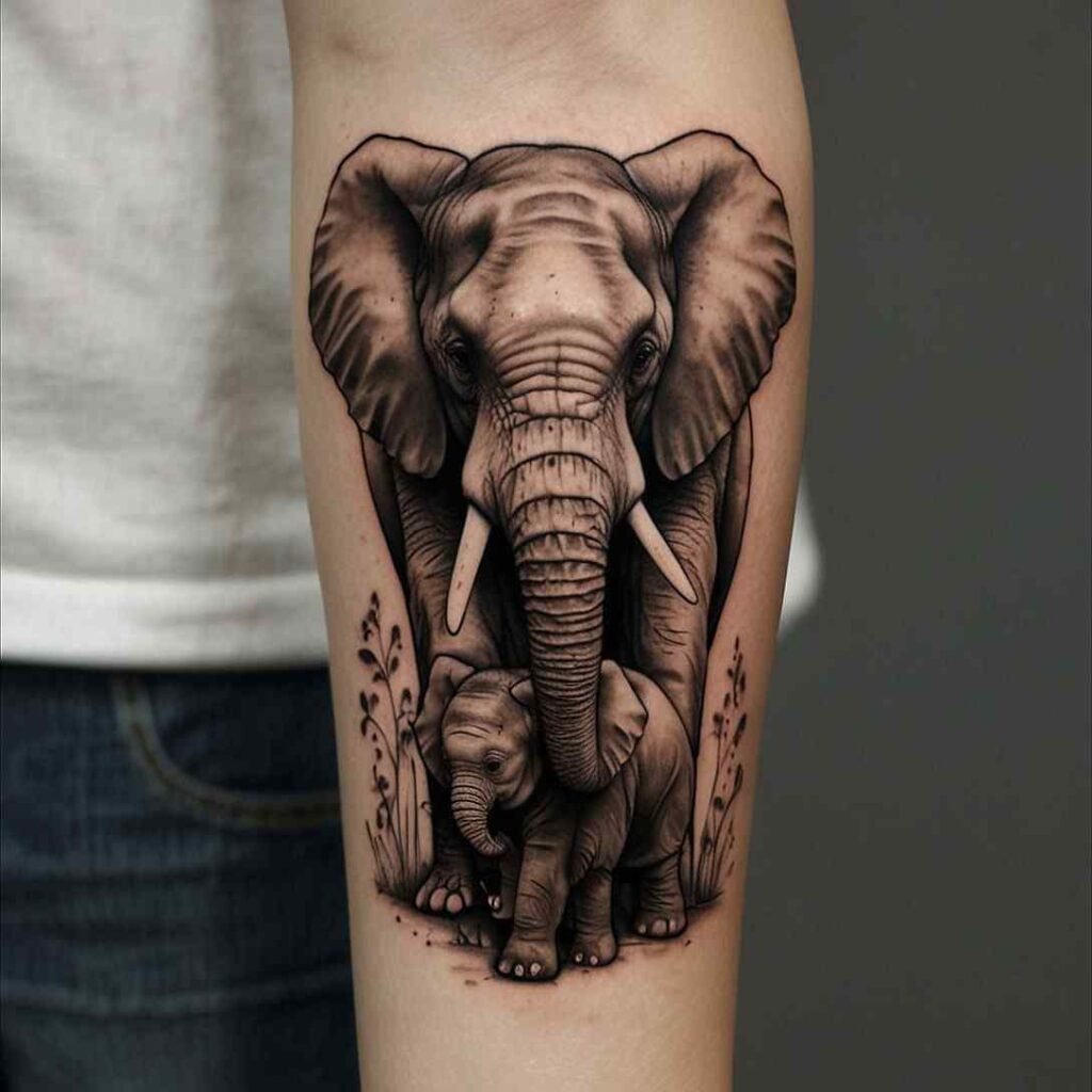 Elephants are known for their strong family bonds and protective nature. A tattoo of a mother elephant with her baby walking behind her symbolizes love, protection, and guidance. It’s a perfect representation of the relationship between a mother and her first child.