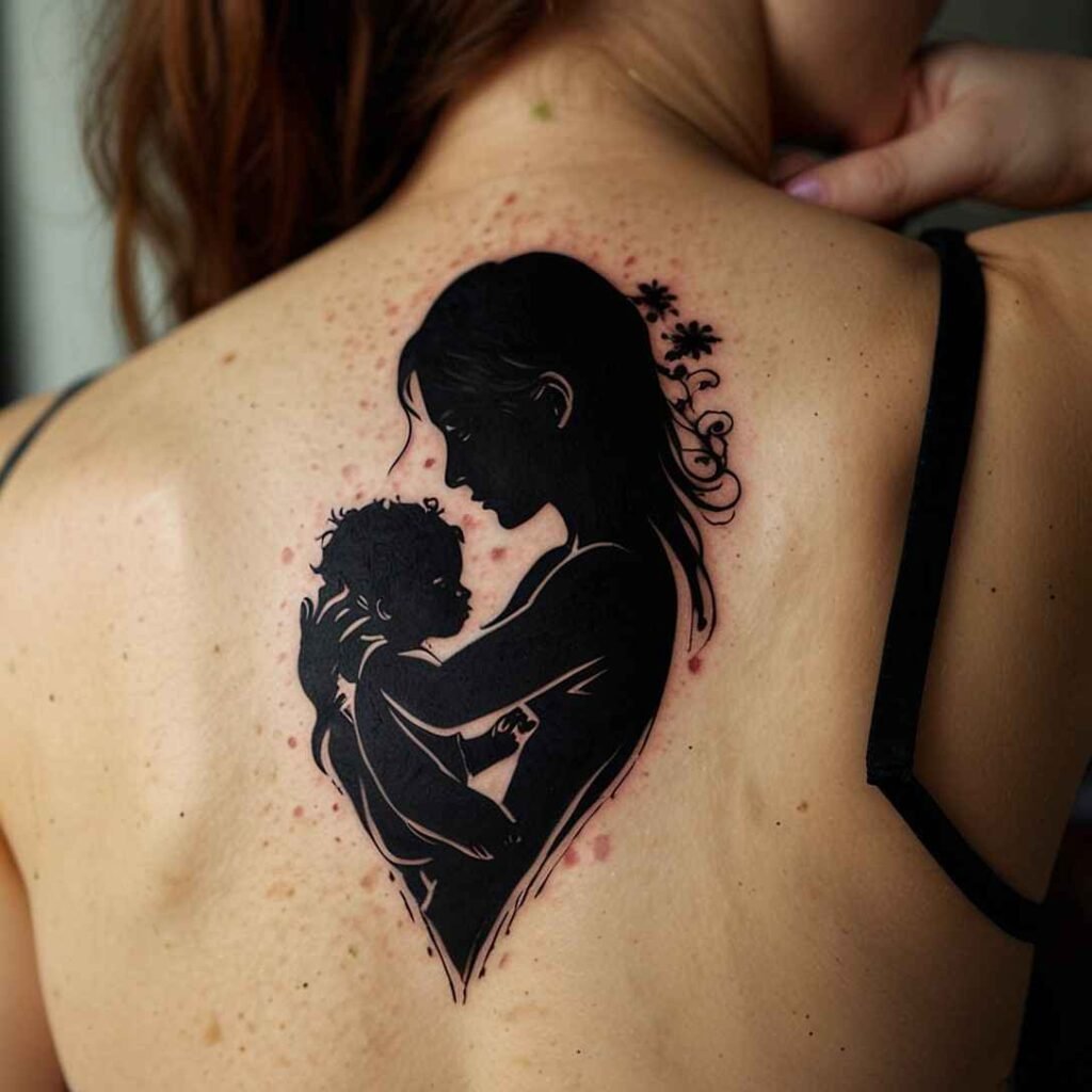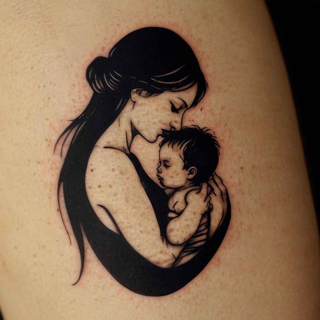 A silhouette of a mother holding her child is a touching and artistic design. It symbolizes the deep bond between a mother and her firstborn. This tattoo can be simple or detailed, and it looks great on the arm or back. It’s a visual representation of the love and protection you provide as a mother.
