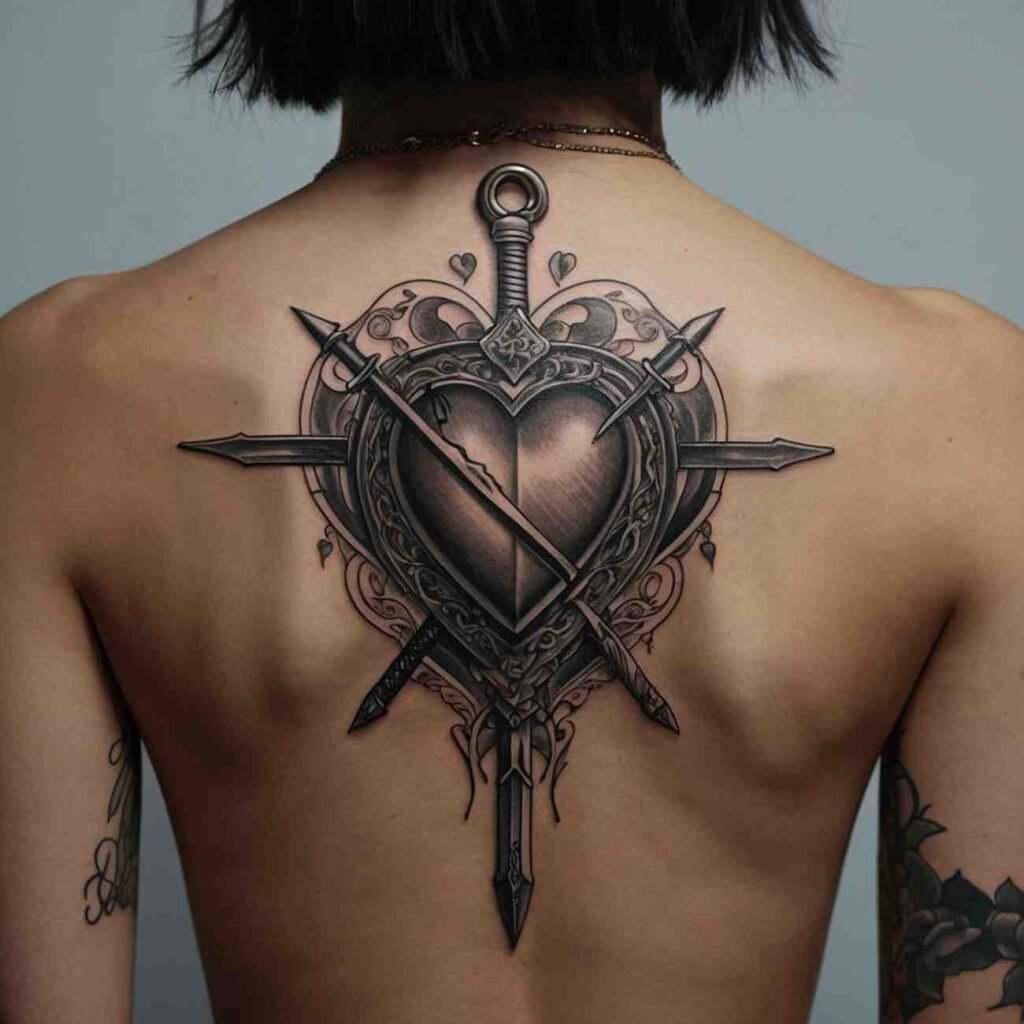 A heart combined with a sword is a striking design that represents the strength found in love and the courage it takes to protect it.