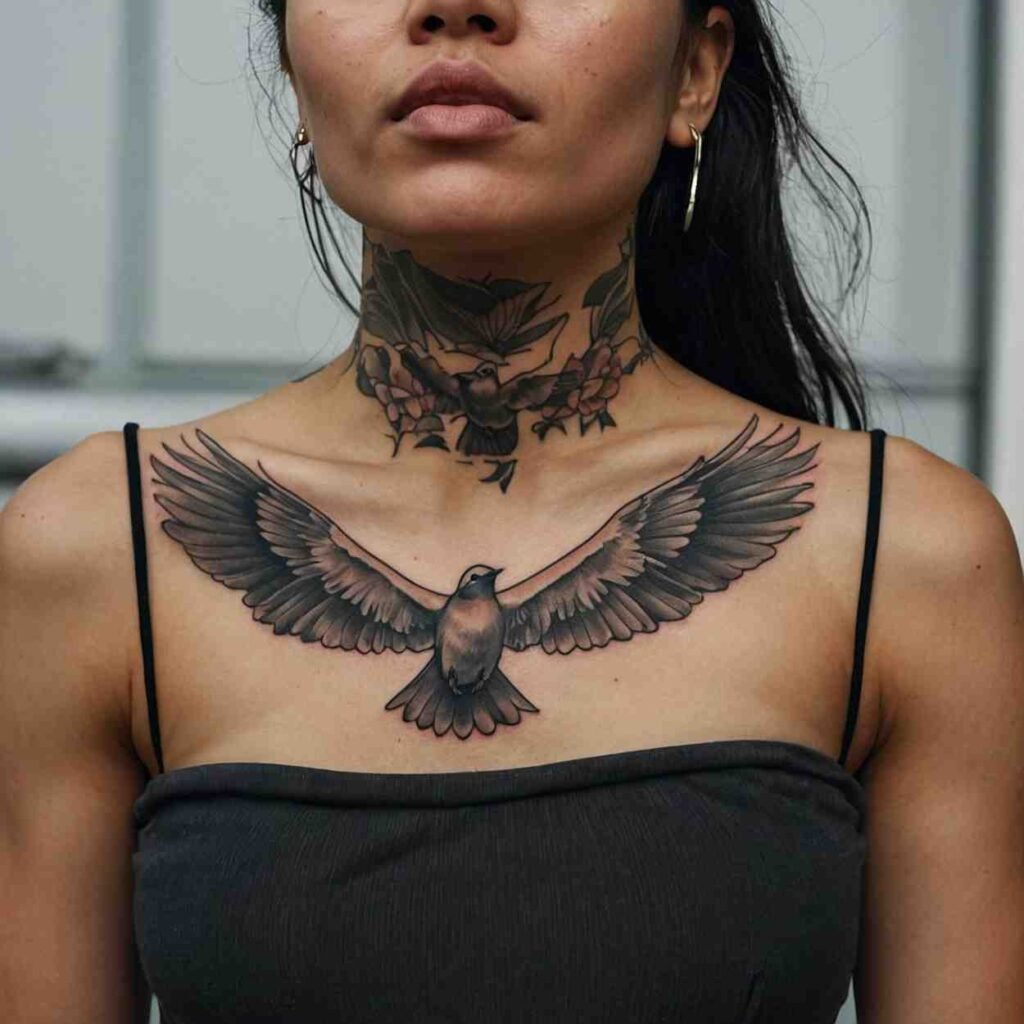 Birds are often associated with freedom and independence. A tattoo of birds soaring from your chest up to your neck can represent the pursuit of dreams or breaking free from constraints.