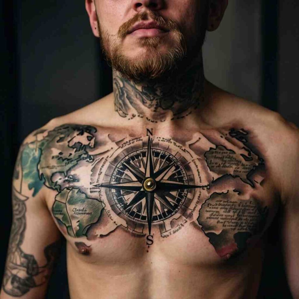 A compass tattoo is perfect for those who feel connected to adventure and exploration. Adding a map to extend from the chest to the neck symbolizes a journey, whether physical or personal.