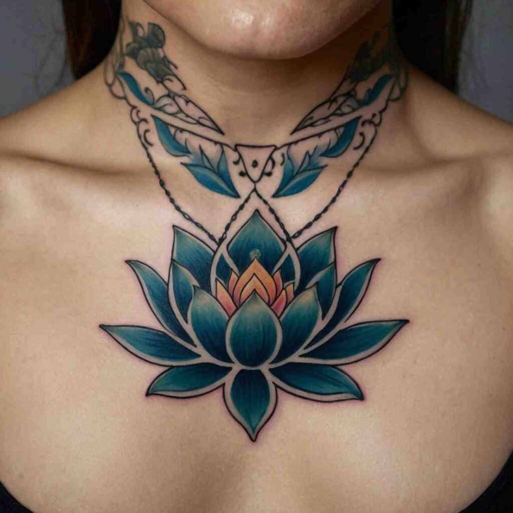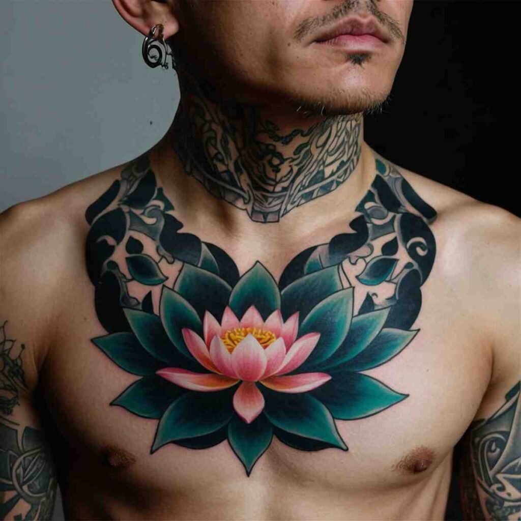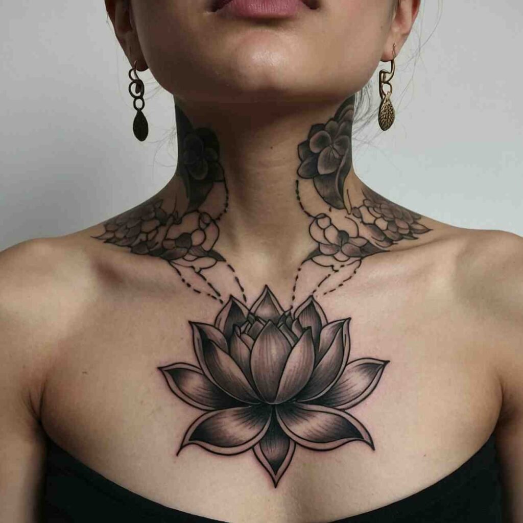 The lotus represents purity and enlightenment. A tattoo starting on the chest and stretching toward the neck can symbolize personal growth and spiritual awakening.